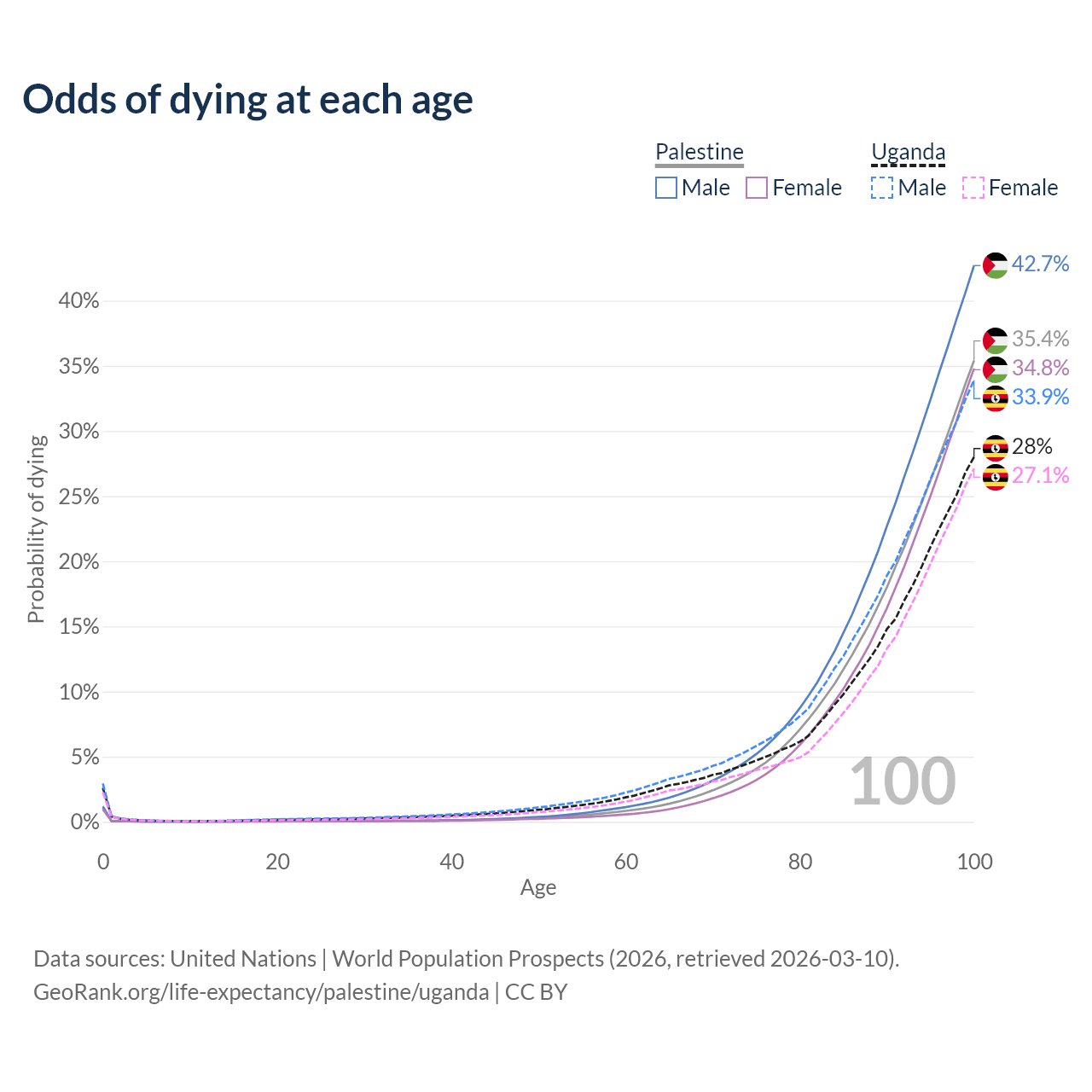 This life expectancy calculator shows the odds of living to 100, 95, 90, and below based on current age for both males and females in Palestine and Uganda, along with mean and median age of death. The calculations are based on the 2026 life tables (actuarial tables) from the UN World Population Prospects.