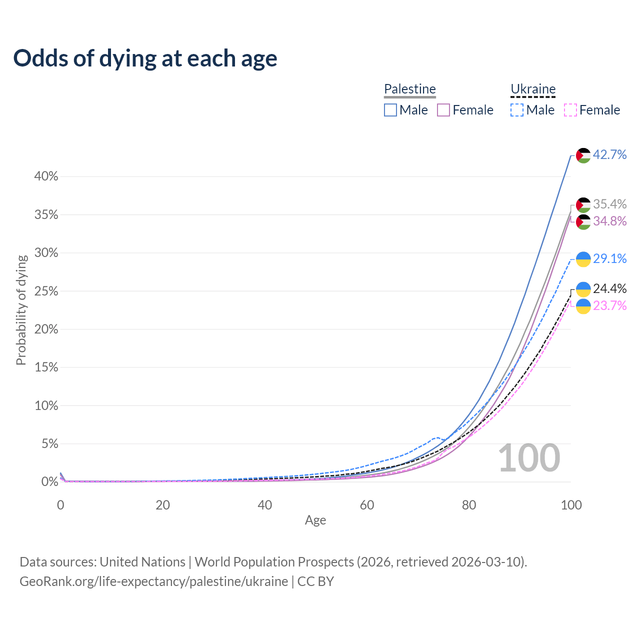 This life expectancy calculator shows the odds of living to 100, 95, 90, and below based on current age for both males and females in Palestine and Ukraine, along with mean and median age of death. The calculations are based on the 2026 life tables (actuarial tables) from the UN World Population Prospects.