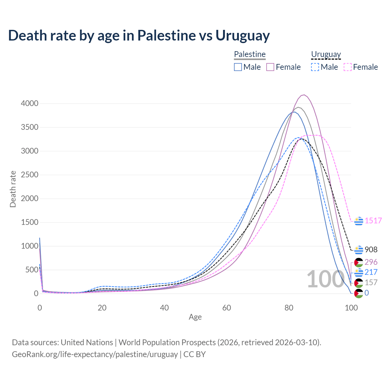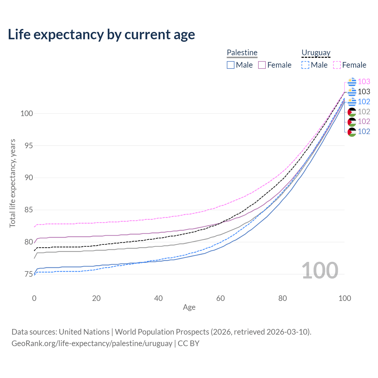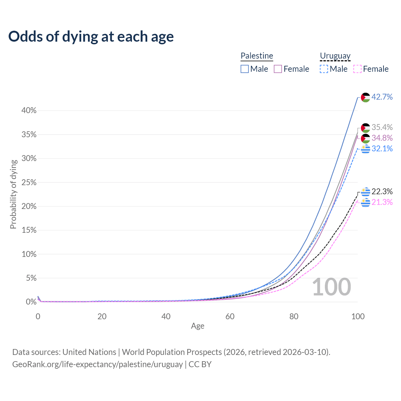 This life expectancy calculator shows the odds of living to 100, 95, 90, and below based on current age for both males and females in Palestine and Uruguay, along with mean and median age of death. The calculations are based on the 2026 life tables (actuarial tables) from the UN World Population Prospects.