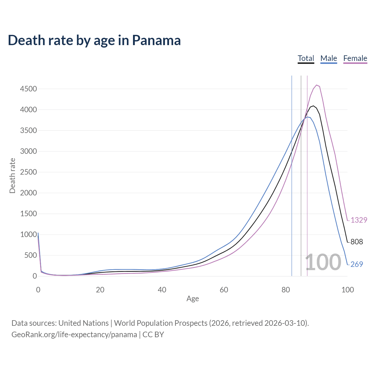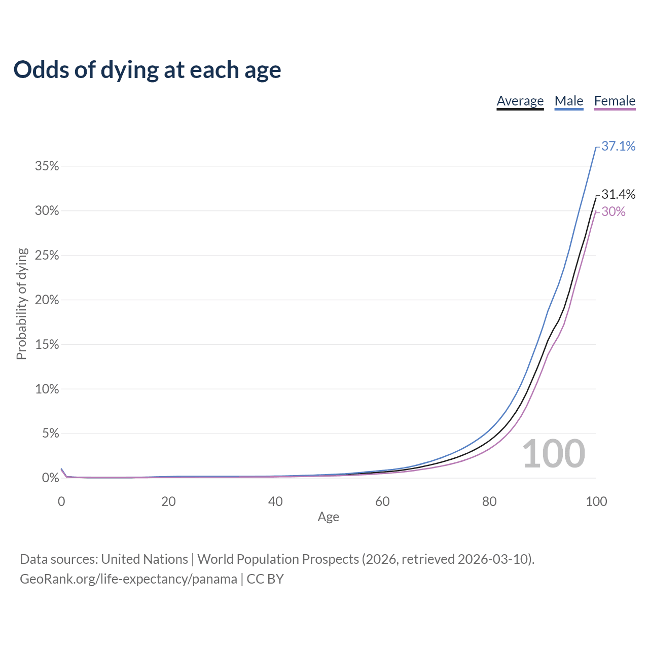 This life expectancy calculator shows the odds of living to 100, 95, 90, and below based on current age for both males and females in Panama, along with mean and median age of death. The calculations are based on the 2026 life tables (actuarial tables) from the UN World Population Prospects.