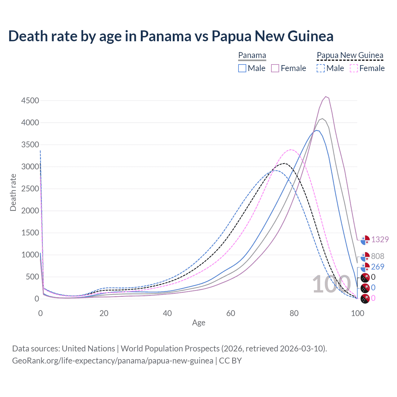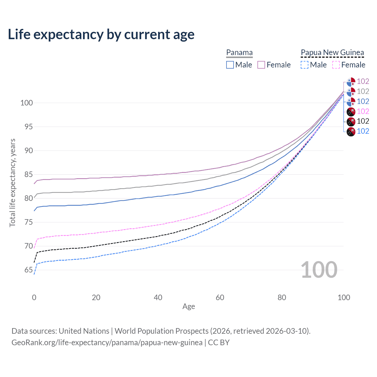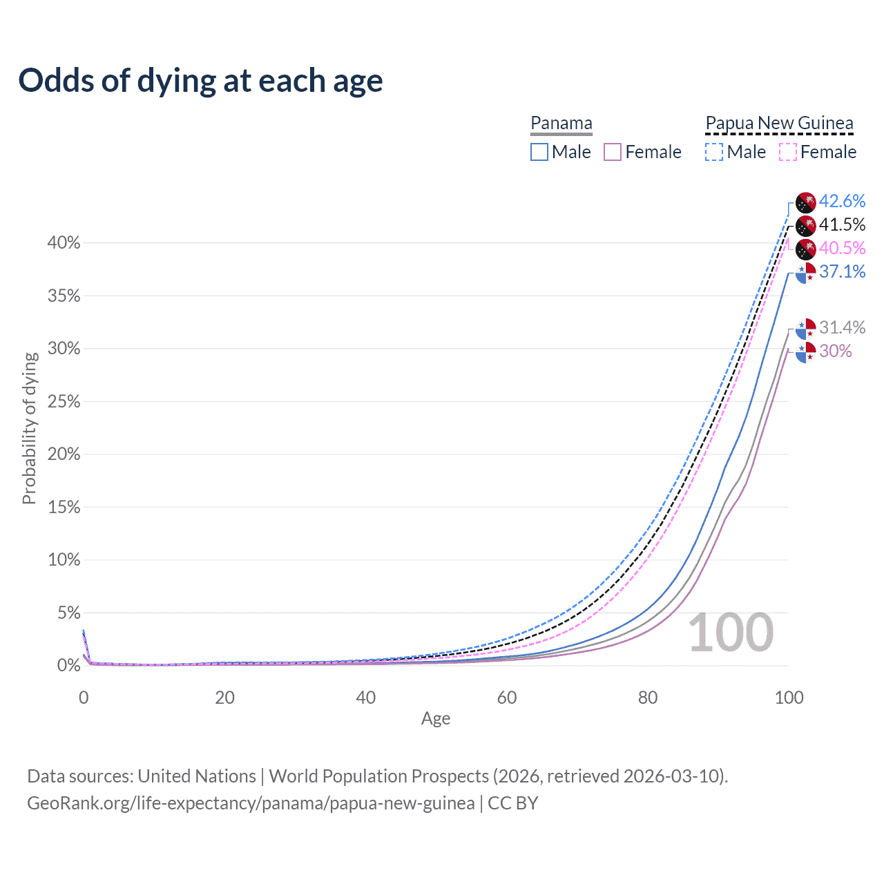 This life expectancy calculator shows the odds of living to 100, 95, 90, and below based on current age for both males and females in Panama and Papua New Guinea, along with mean and median age of death. The calculations are based on the 2026 life tables (actuarial tables) from the UN World Population Prospects.