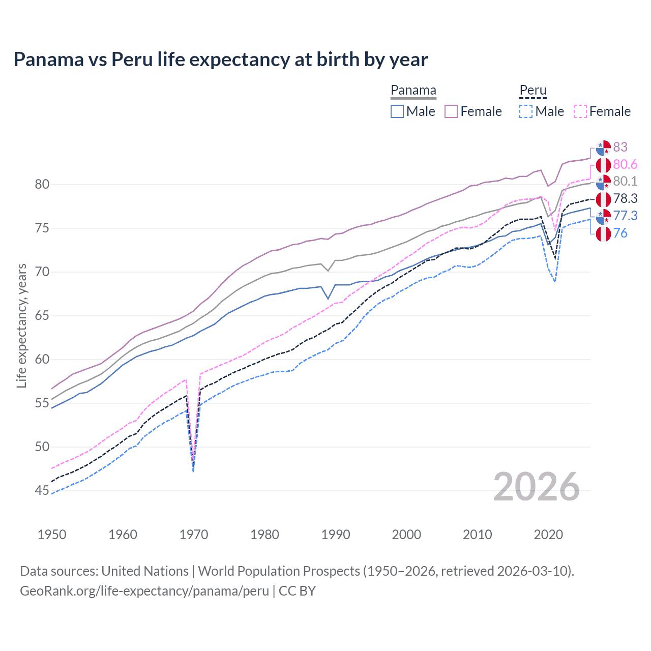 The average life expectancy at birth is 80.1 years in Panama vs 78.3 in Peru. Panama is ranked 45/197 by life expectancy, and Peru is 59/197. In Panama, the life expectancy is 77.3 years for males and 83 years for females. In Peru, it's 76 years for males and 80.6 years for females.