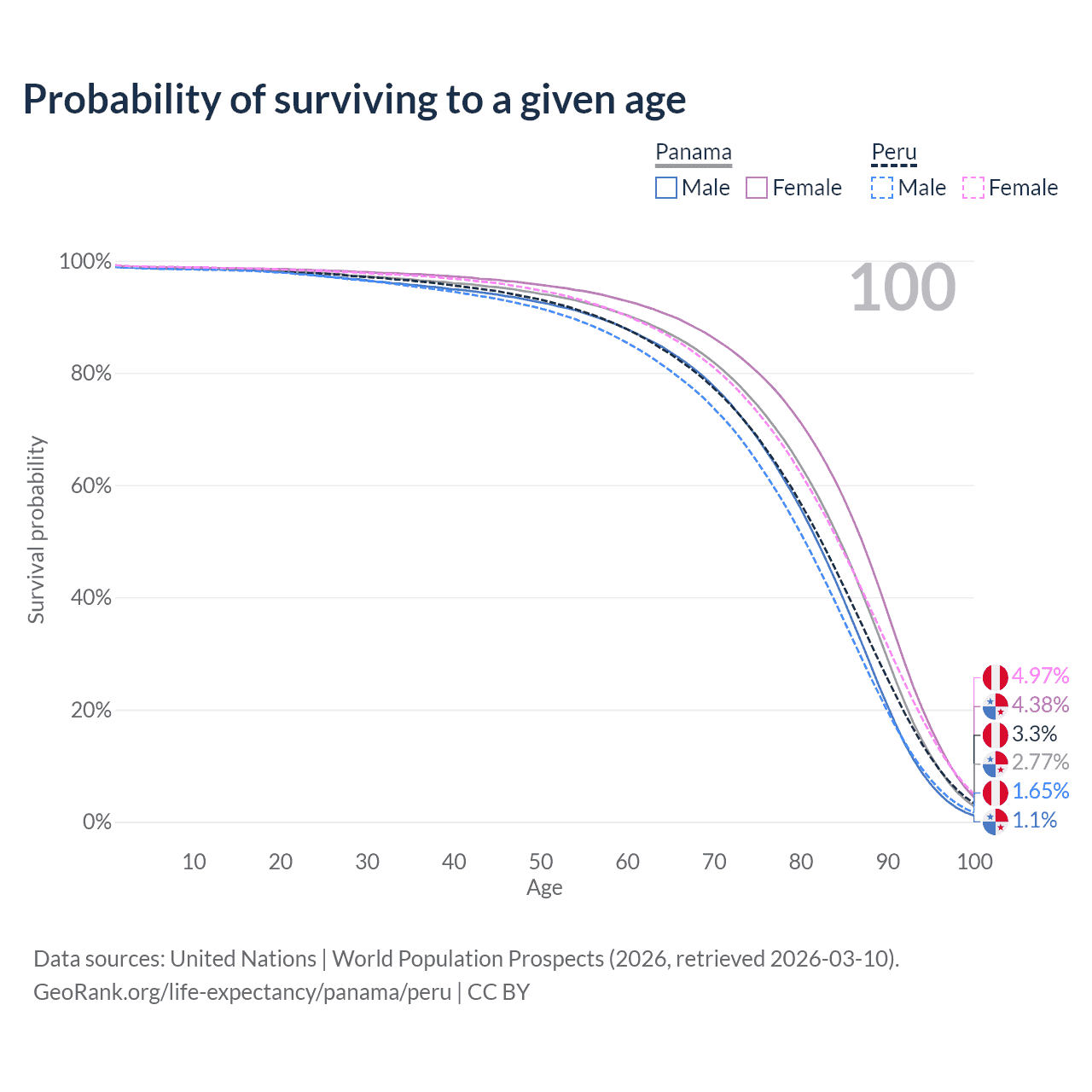 This life expectancy calculator shows the odds of living to 100, 95, 90, and below based on current age for both males and females in Panama and Peru, along with mean and median age of death. The calculations are based on the 2026 life tables (actuarial tables) from the UN World Population Prospects.