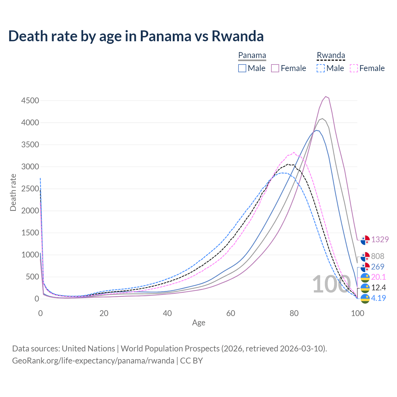 In Panama, the most common age of death is 89, compared to 78 in Rwanda. The median age of death is 84.6 in Panama and 73.5 in Rwanda, meaning only half of each cohort is expected to live past that age.