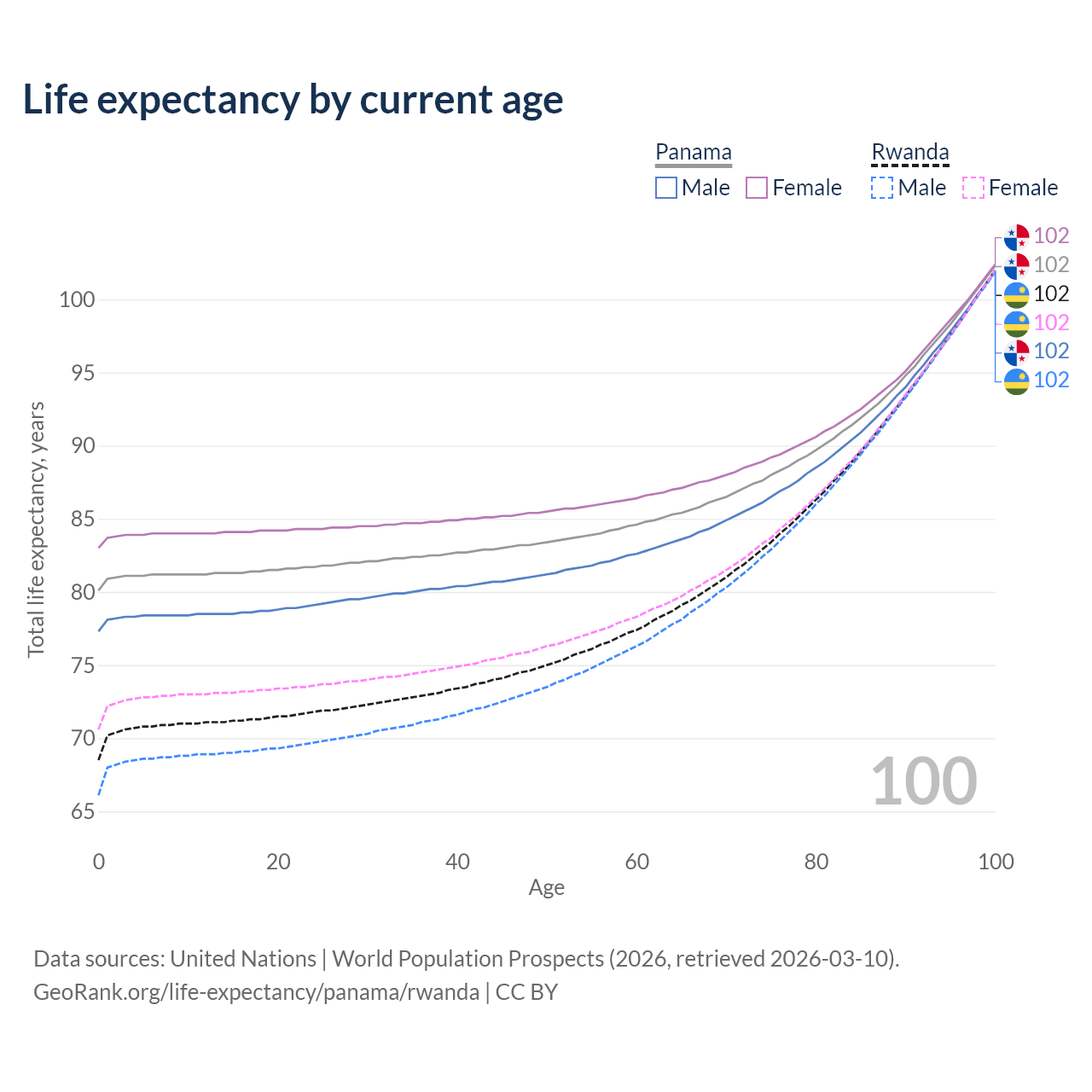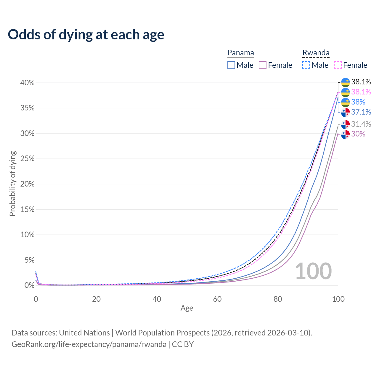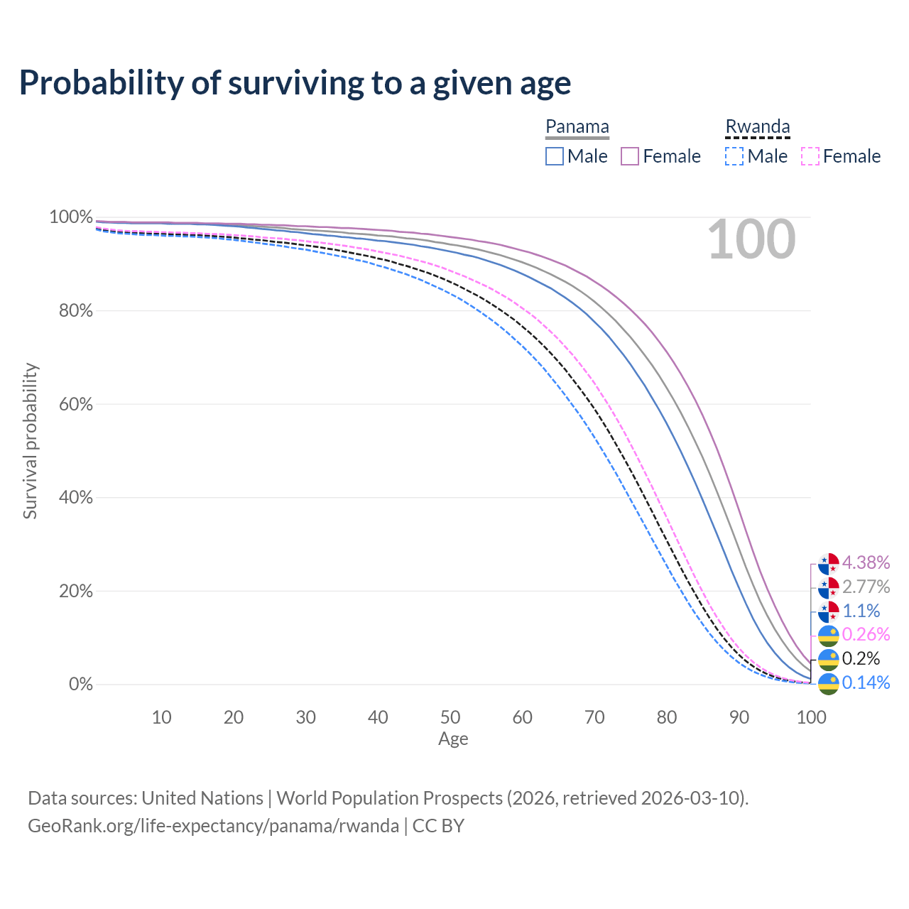 This life expectancy calculator shows the odds of living to 100, 95, 90, and below based on current age for both males and females in Panama and Rwanda, along with mean and median age of death. The calculations are based on the 2026 life tables (actuarial tables) from the UN World Population Prospects.