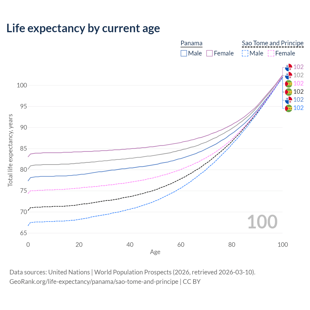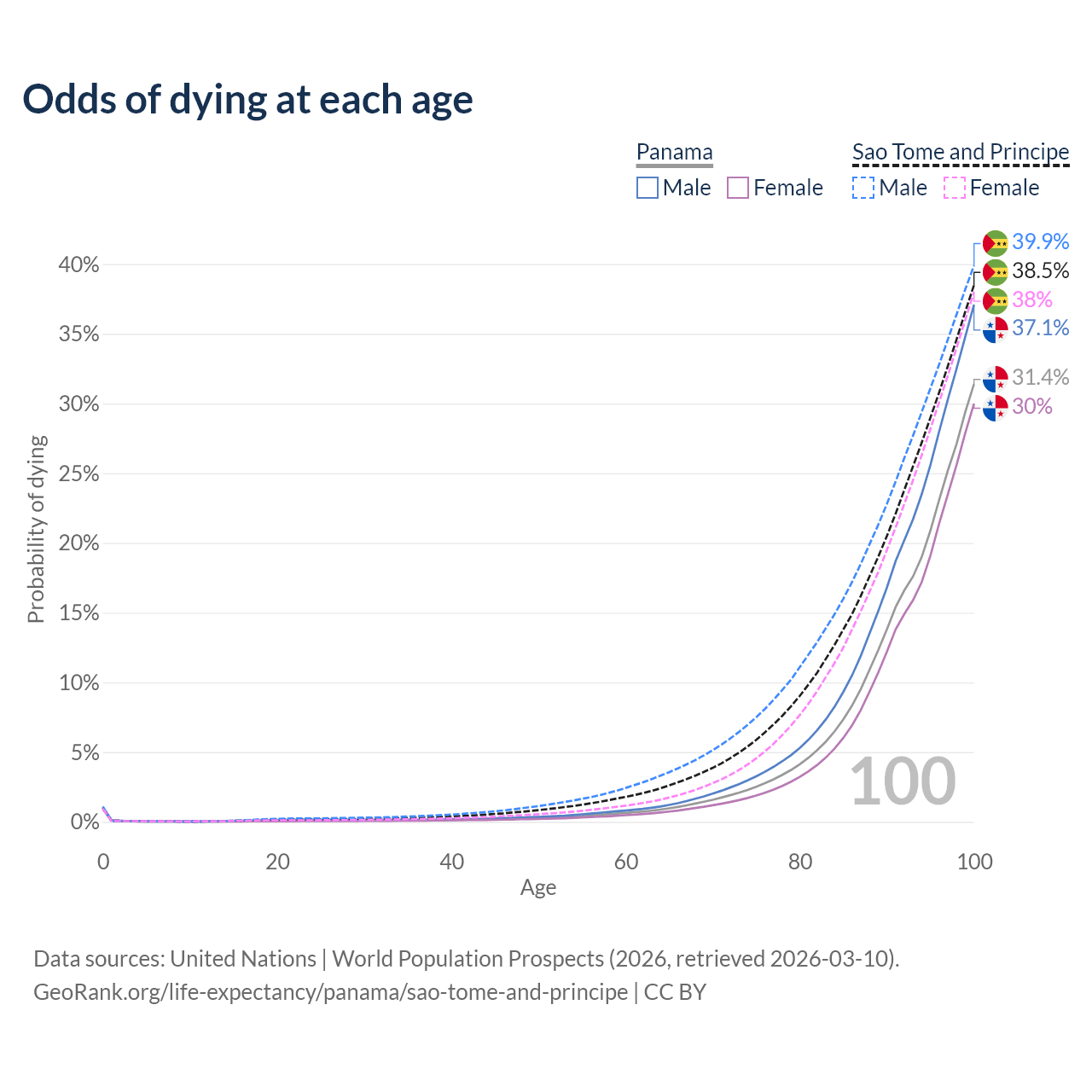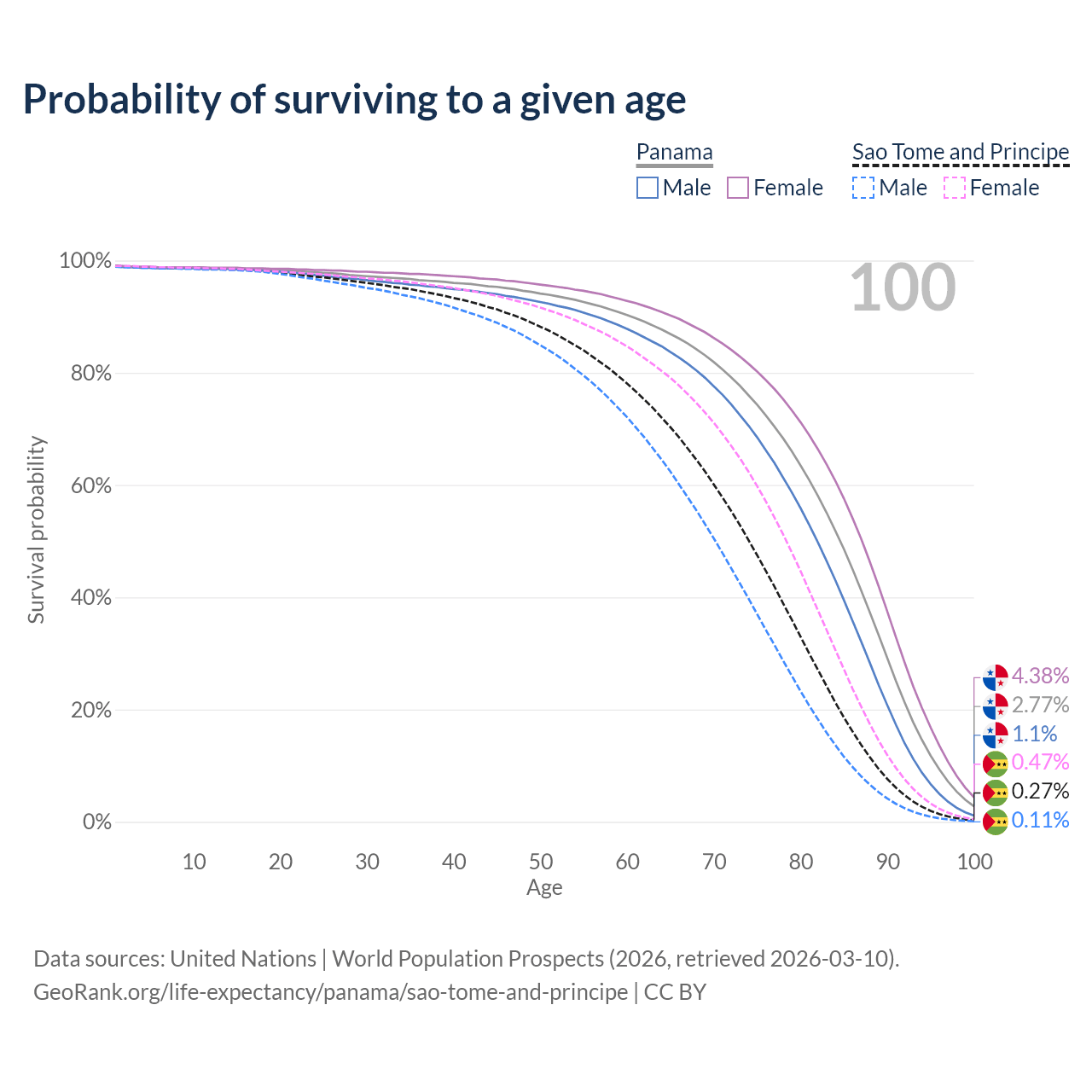 This life expectancy calculator shows the odds of living to 100, 95, 90, and below based on current age for both males and females in Panama and Sao Tome and Principe, along with mean and median age of death. The calculations are based on the 2026 life tables (actuarial tables) from the UN World Population Prospects.