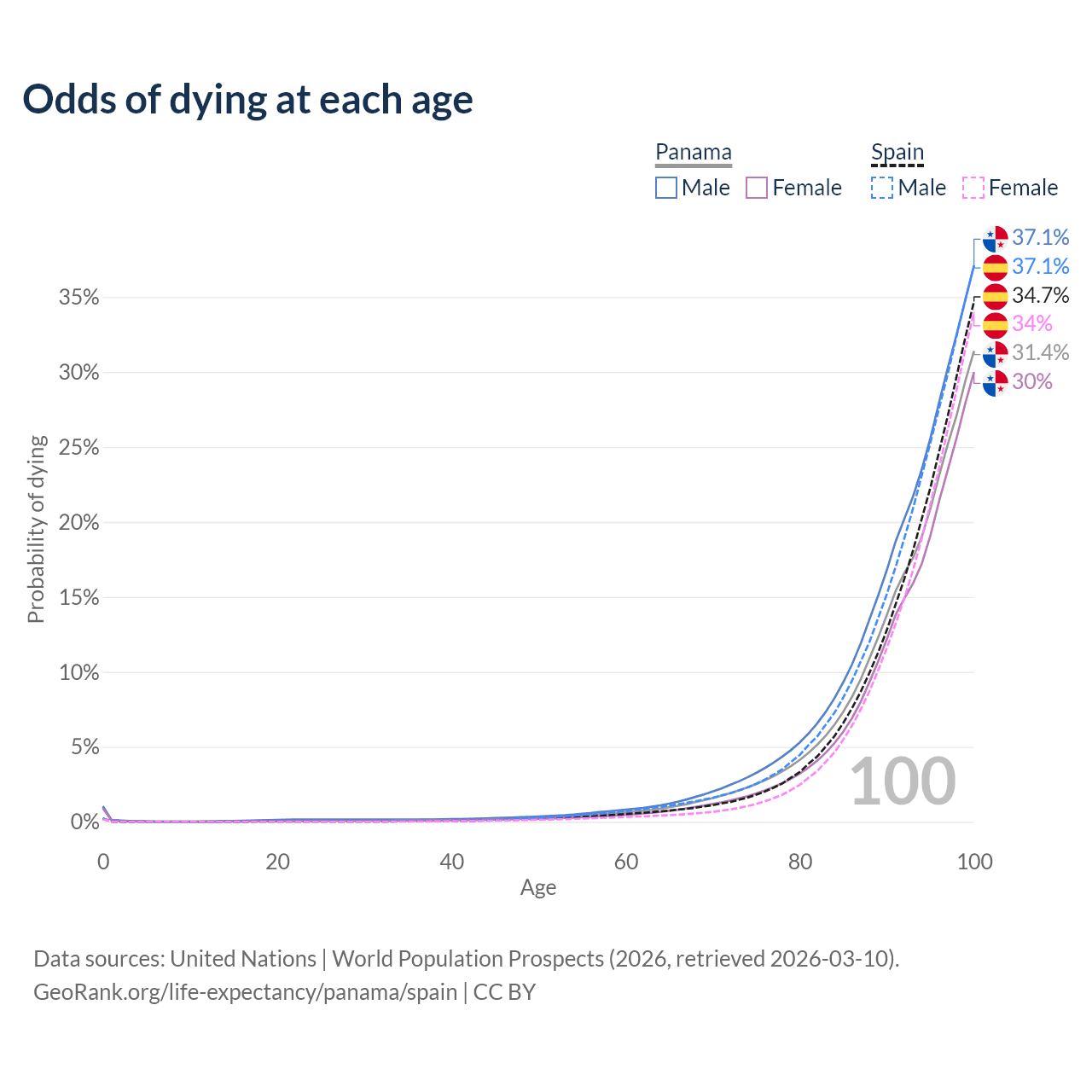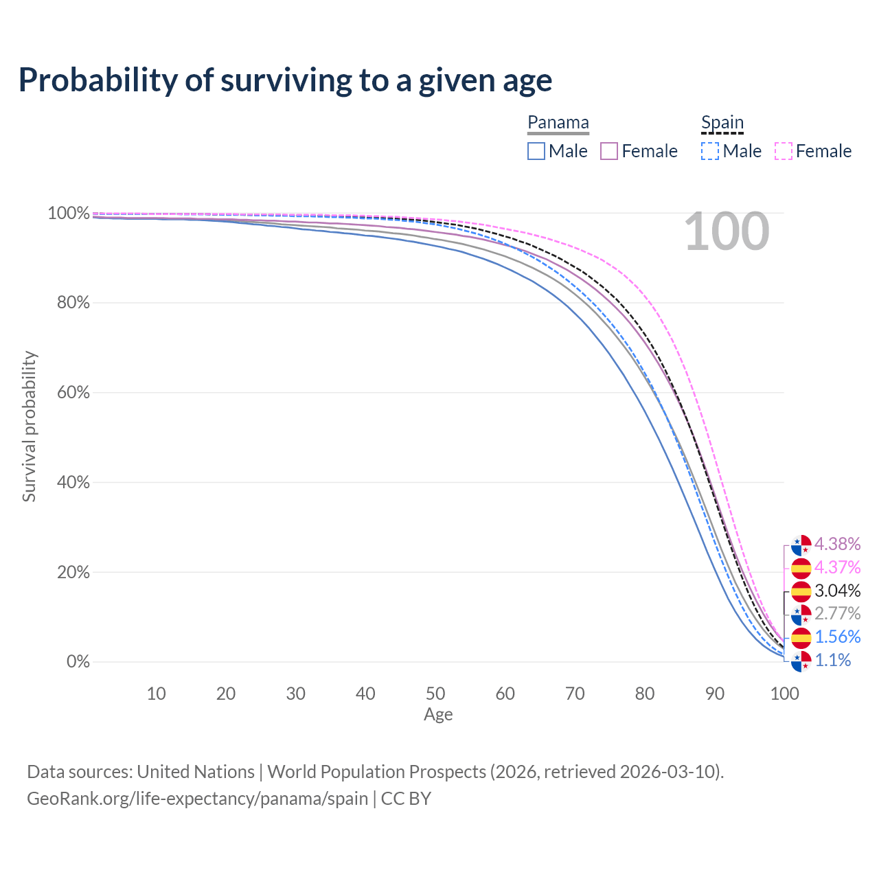 This life expectancy calculator shows the odds of living to 100, 95, 90, and below based on current age for both males and females in Panama and Spain, along with mean and median age of death. The calculations are based on the 2026 life tables (actuarial tables) from the UN World Population Prospects.