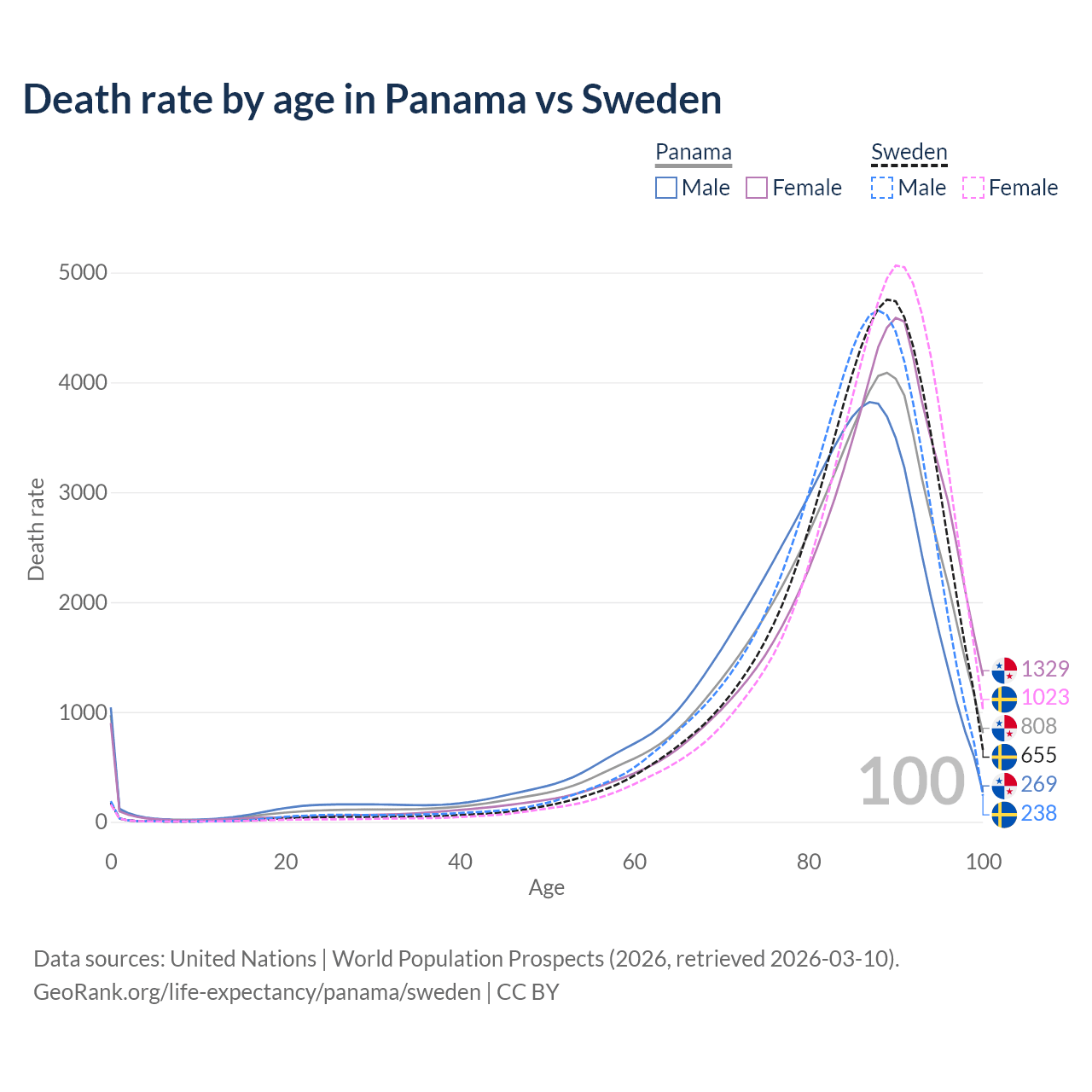 In Panama, the most common age of death is 89, compared to 89 in Sweden. The median age of death is 84.6 in Panama and 86.5 in Sweden, meaning only half of each cohort is expected to live past that age.