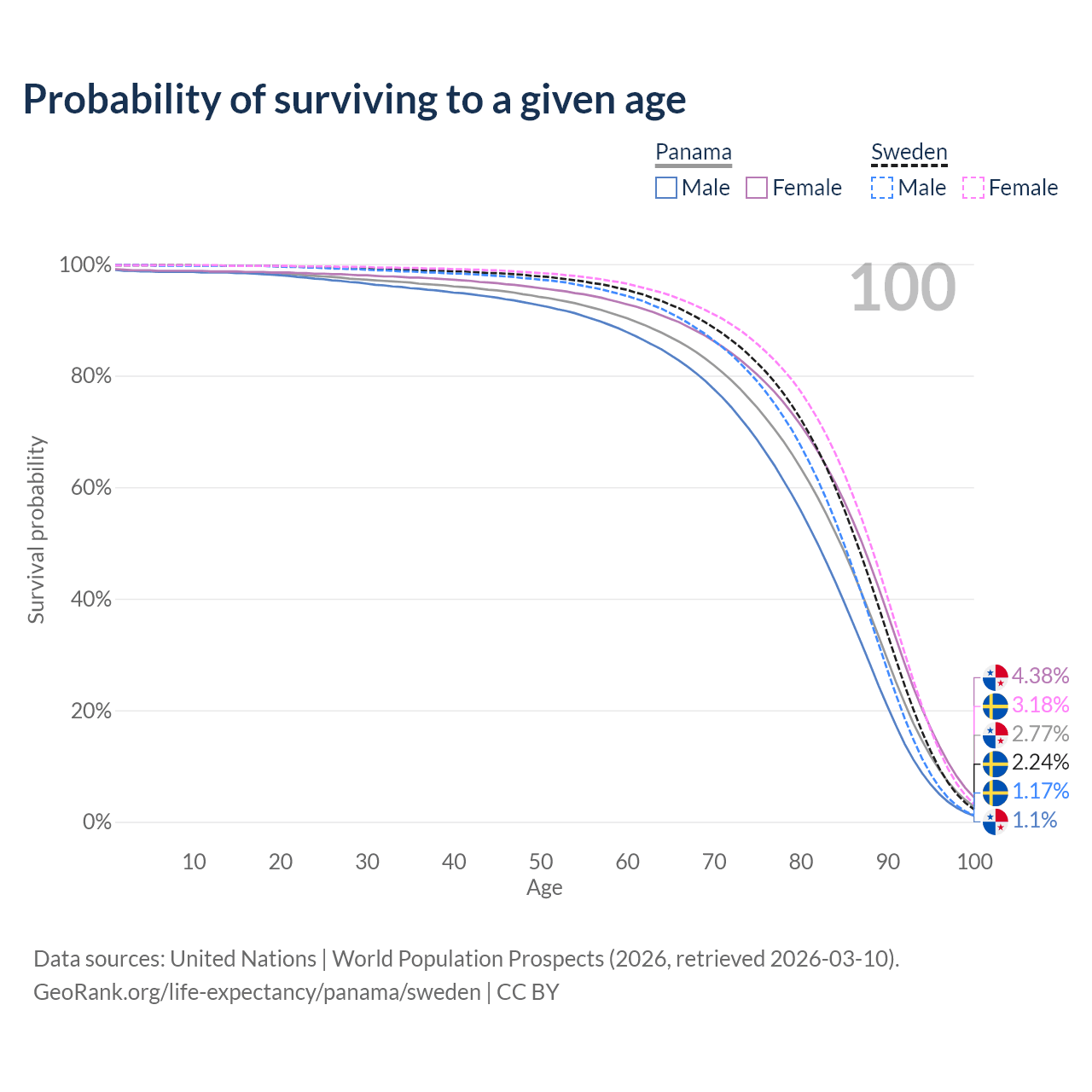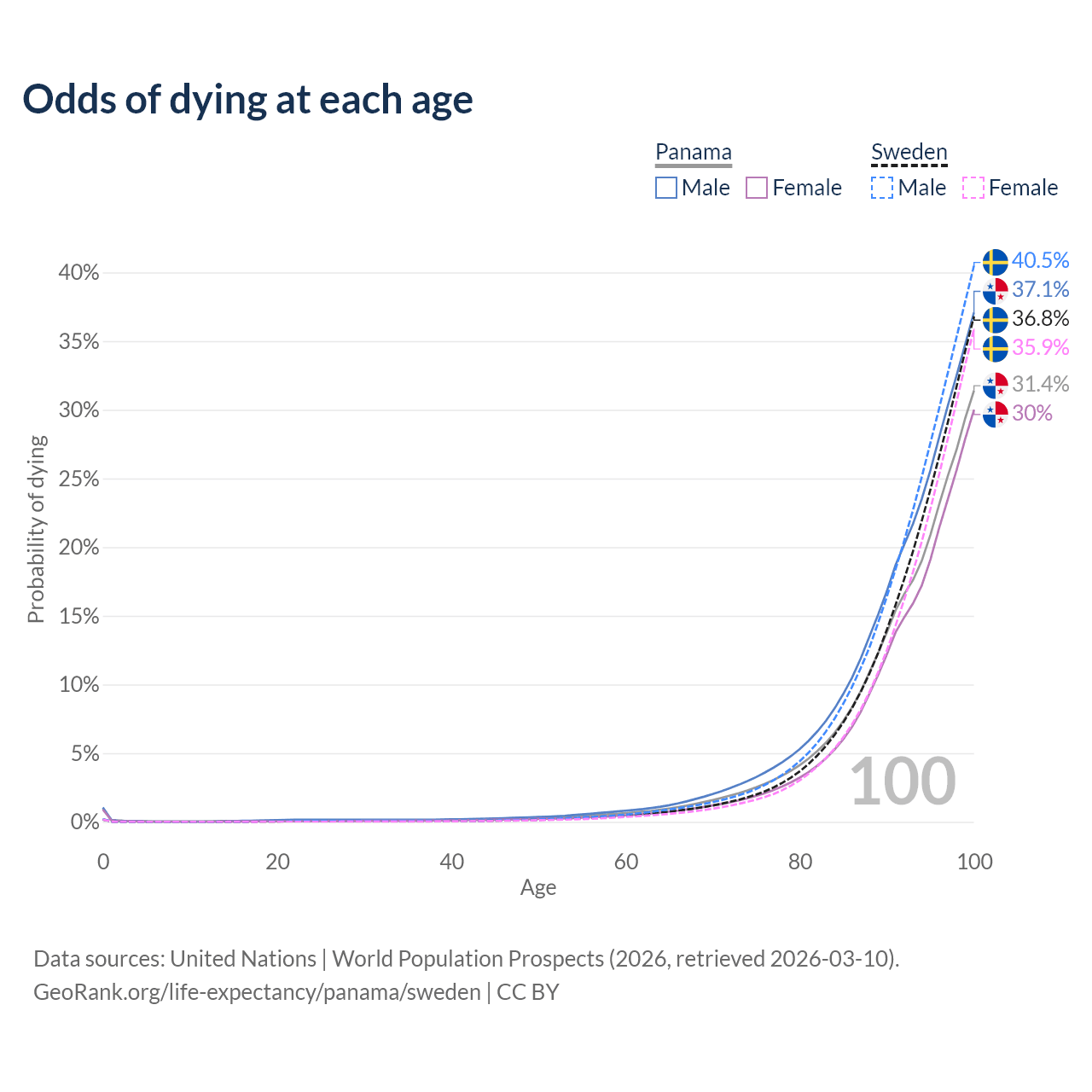 This life expectancy calculator shows the odds of living to 100, 95, 90, and below based on current age for both males and females in Panama and Sweden, along with mean and median age of death. The calculations are based on the 2026 life tables (actuarial tables) from the UN World Population Prospects.