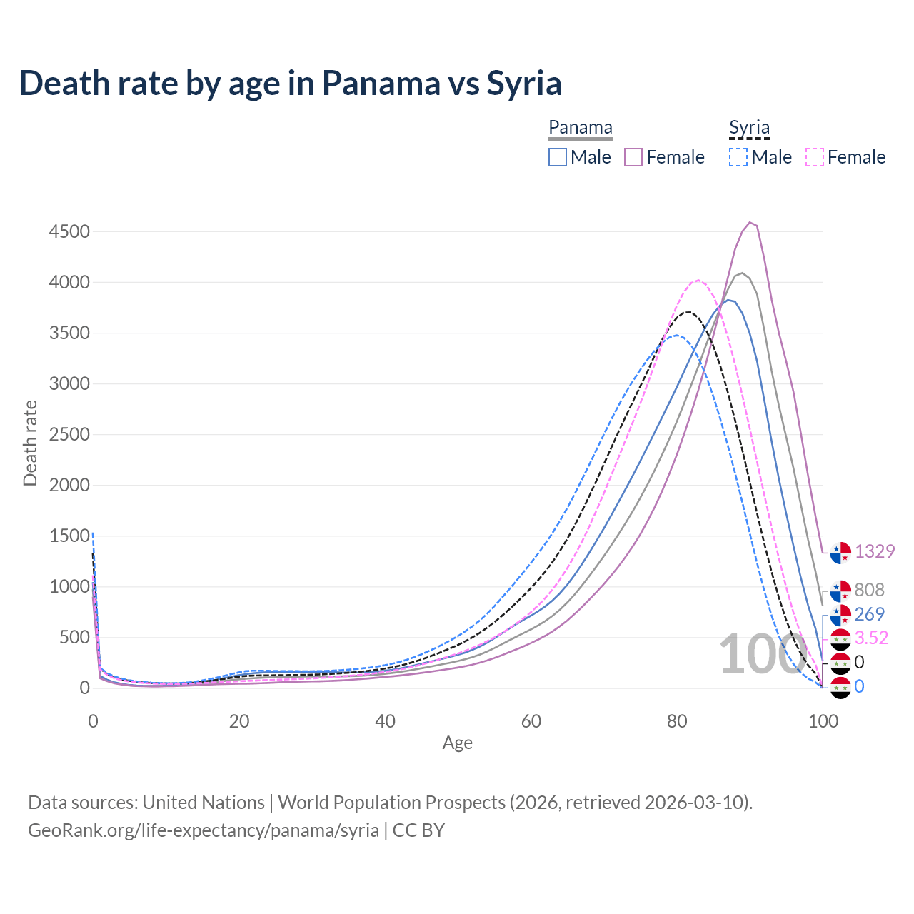 In Panama, the most common age of death is 89, compared to 82 in Syria. The median age of death is 84.6 in Panama and 77.7 in Syria, meaning only half of each cohort is expected to live past that age.