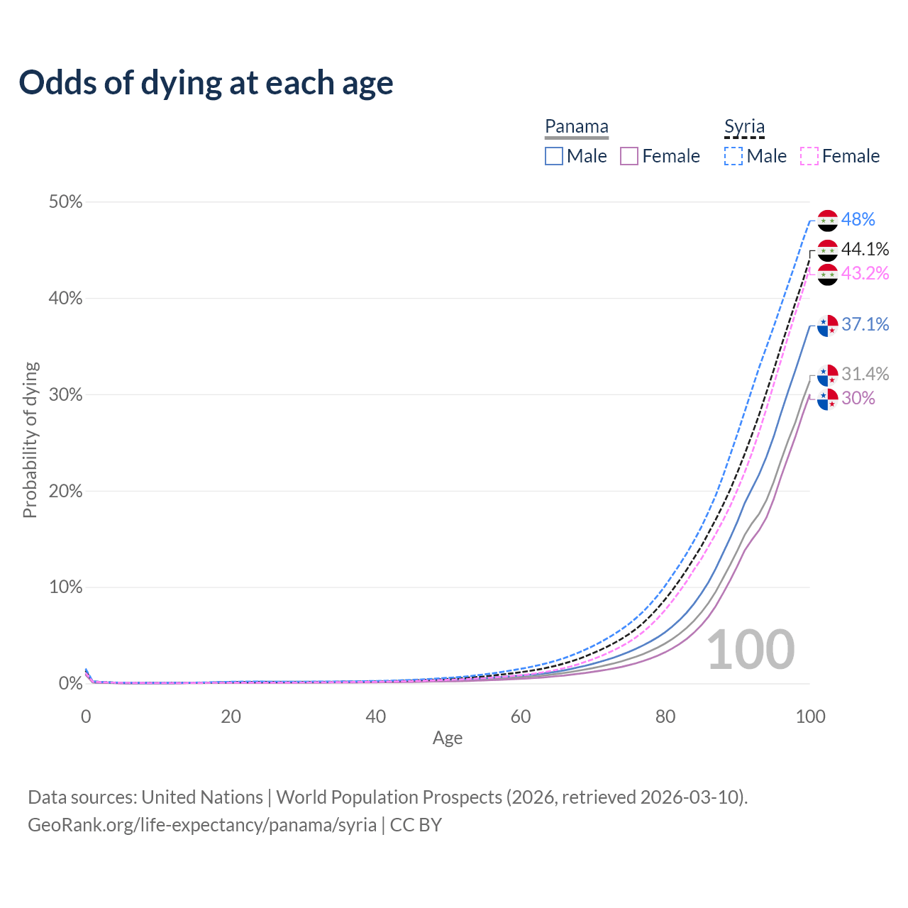 This life expectancy calculator shows the odds of living to 100, 95, 90, and below based on current age for both males and females in Panama and Syria, along with mean and median age of death. The calculations are based on the 2026 life tables (actuarial tables) from the UN World Population Prospects.