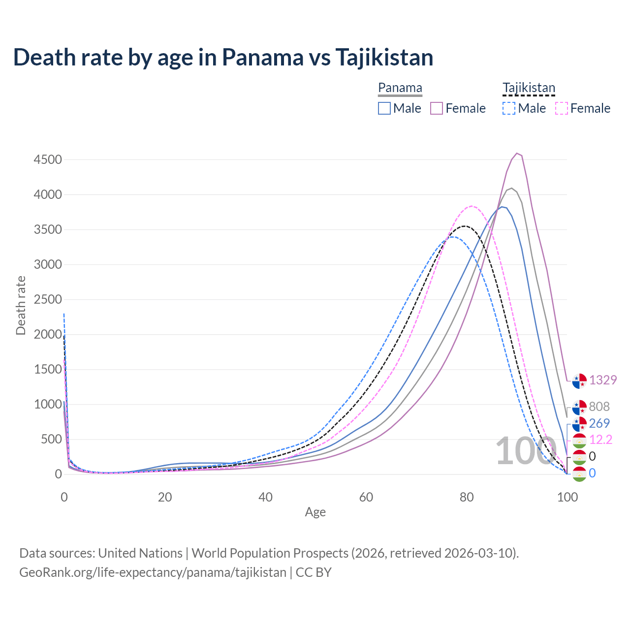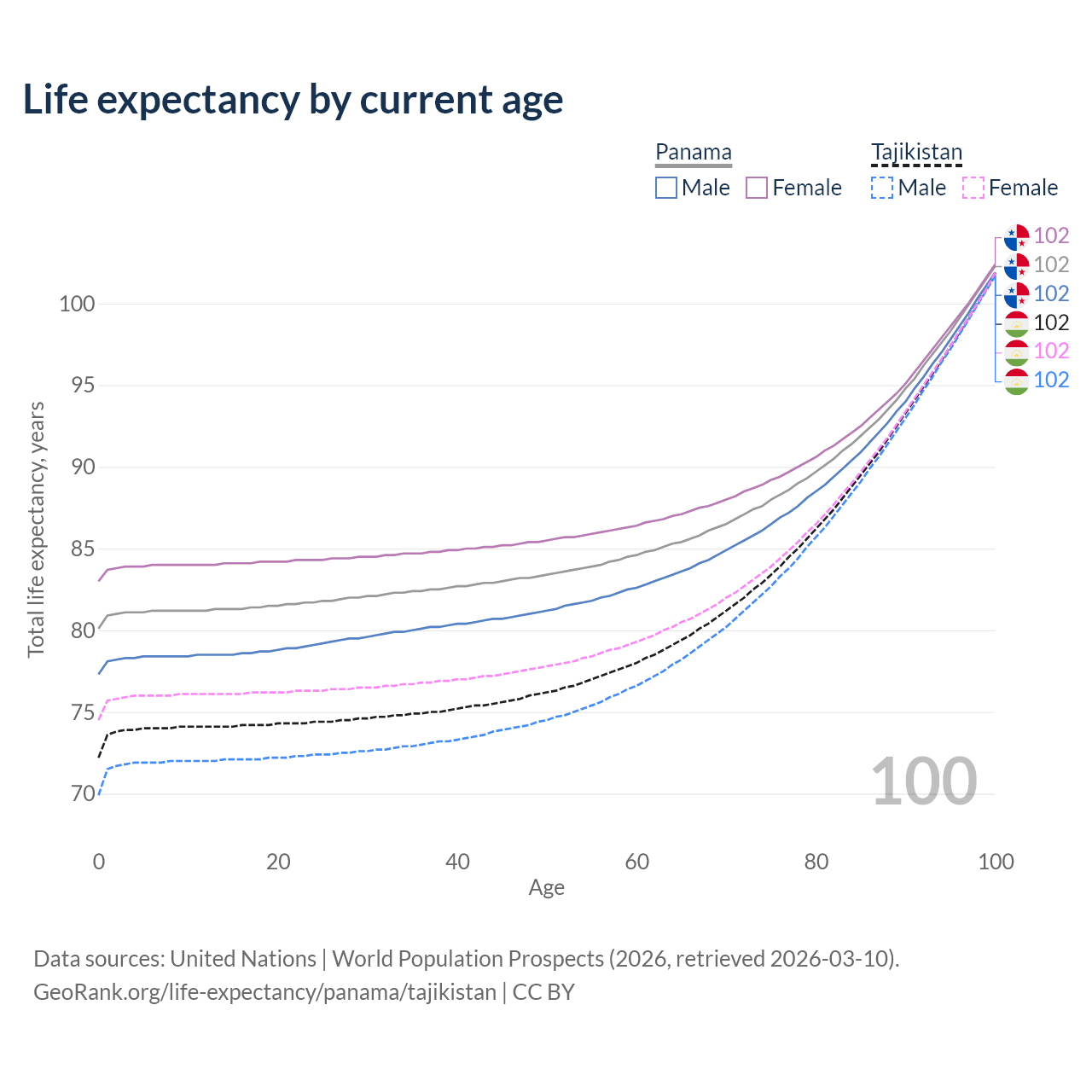 This life expectancy calculator shows the odds of living to 100, 95, 90, and below based on current age for both males and females in Panama and Tajikistan, along with mean and median age of death. The calculations are based on the 2026 life tables (actuarial tables) from the UN World Population Prospects.