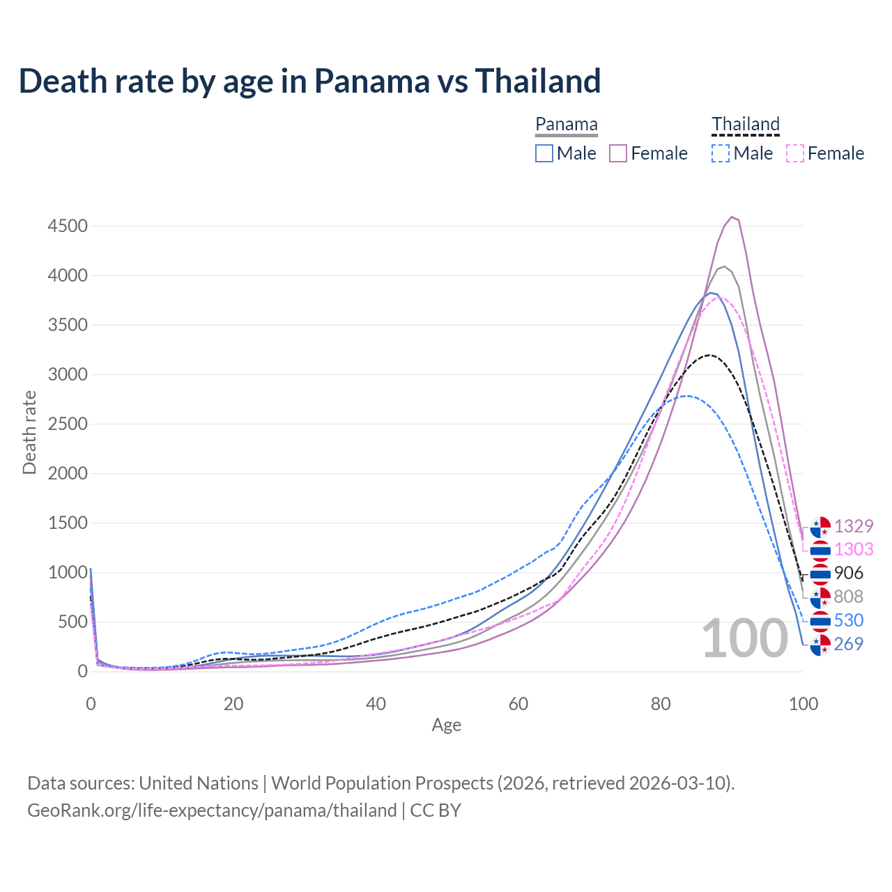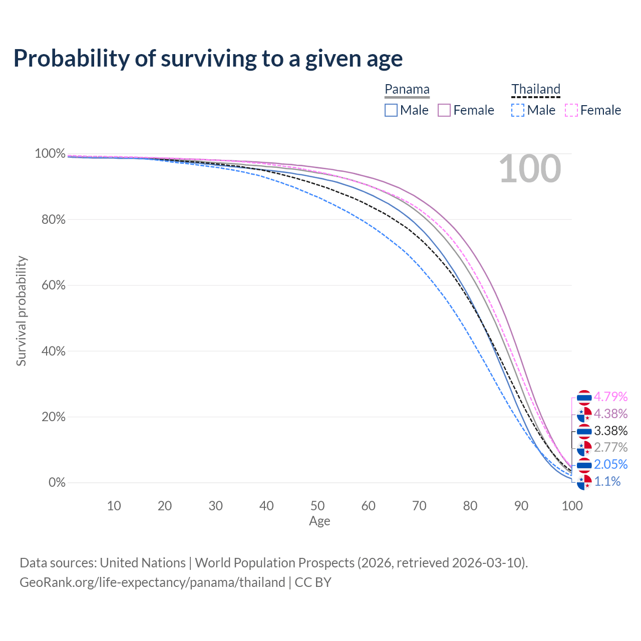 This life expectancy calculator shows the odds of living to 100, 95, 90, and below based on current age for both males and females in Panama and Thailand, along with mean and median age of death. The calculations are based on the 2026 life tables (actuarial tables) from the UN World Population Prospects.