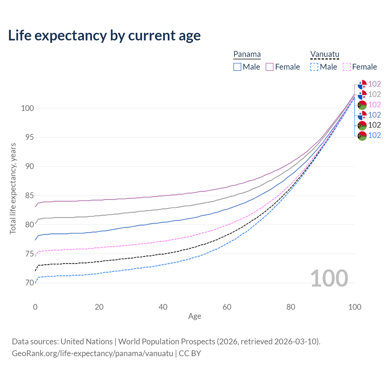 This life expectancy calculator shows the odds of living to 100, 95, 90, and below based on current age for both males and females in Panama and Vanuatu, along with mean and median age of death. The calculations are based on the 2026 life tables (actuarial tables) from the UN World Population Prospects.
