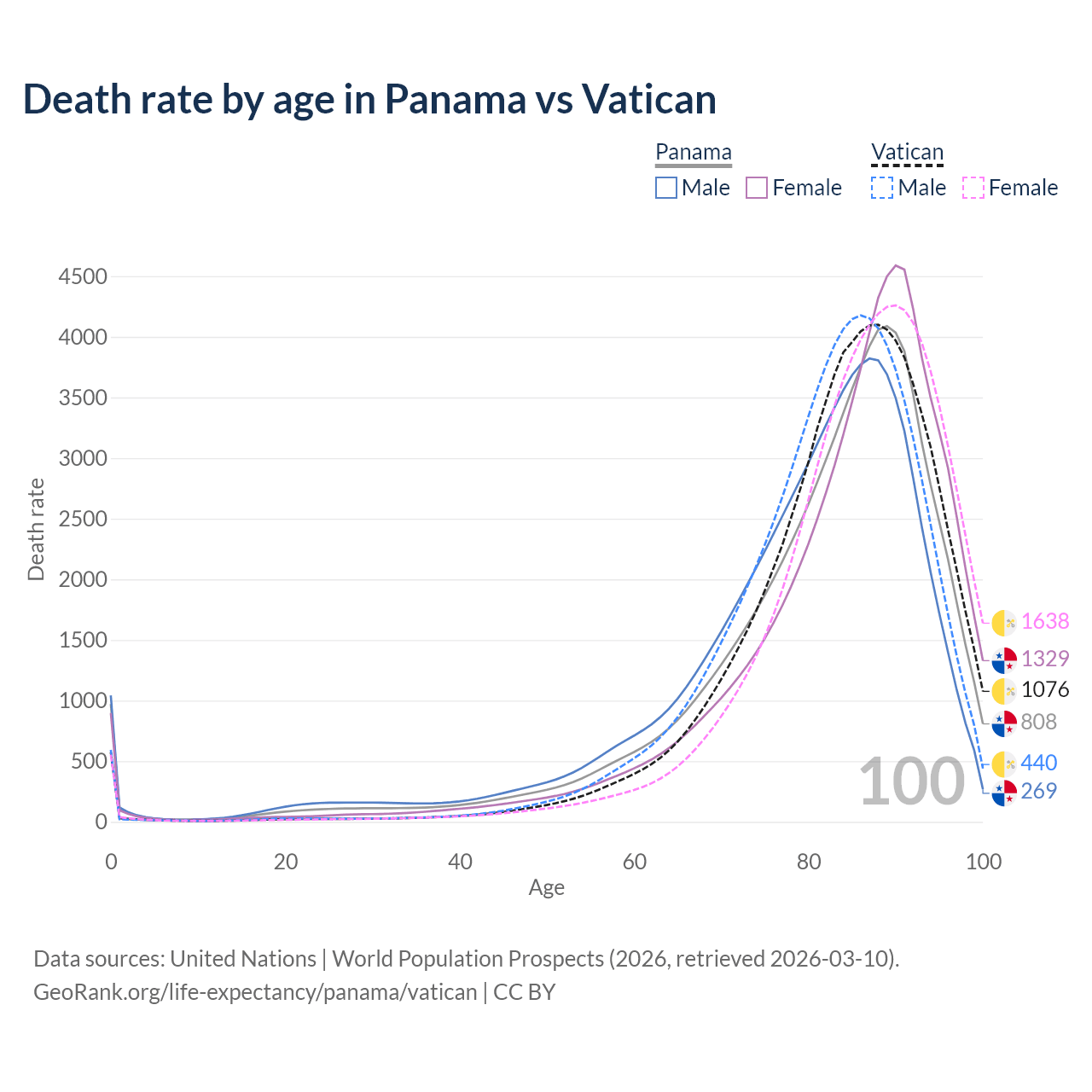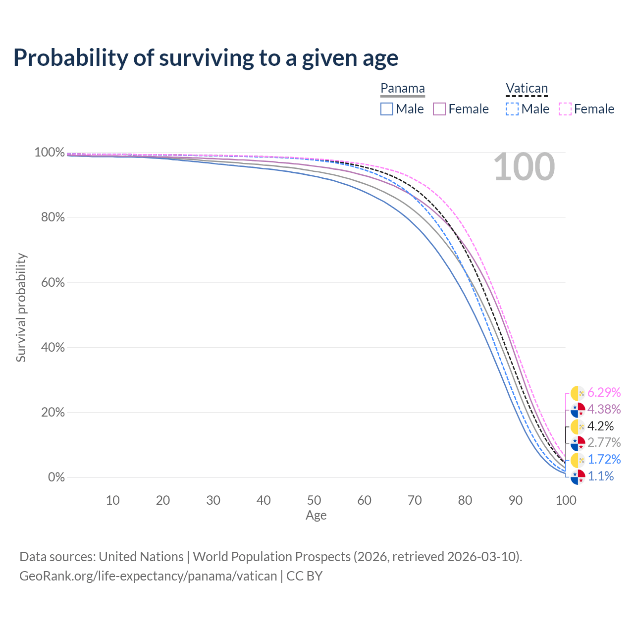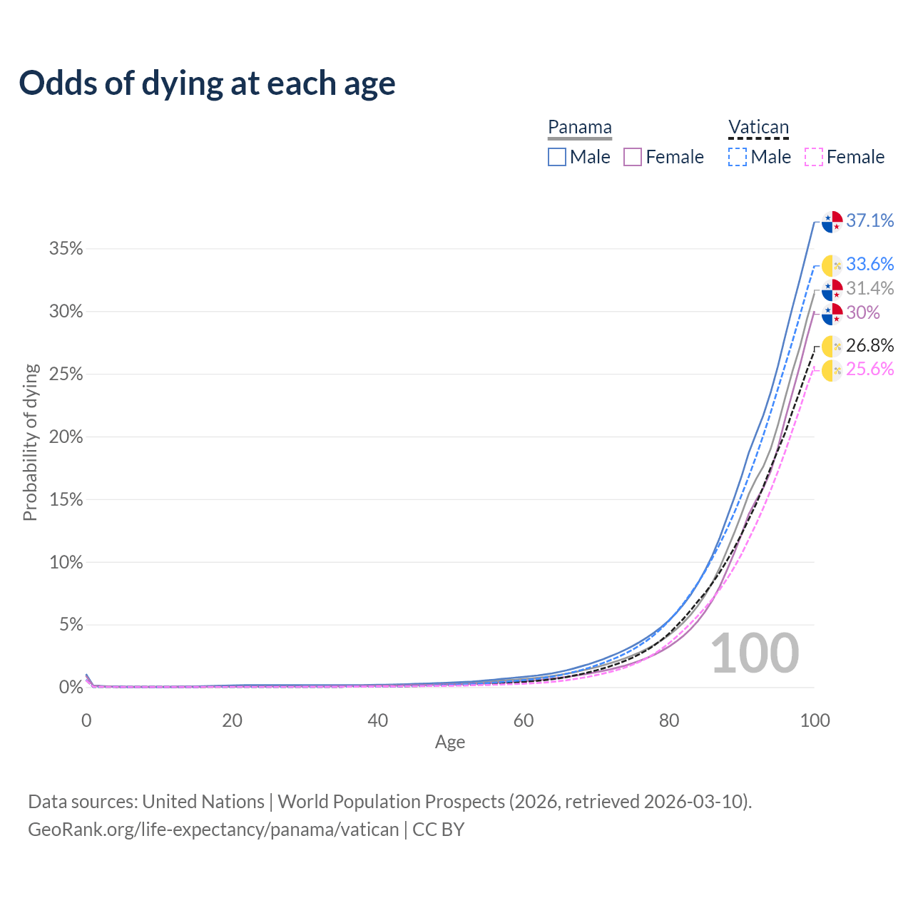 This life expectancy calculator shows the odds of living to 100, 95, 90, and below based on current age for both males and females in Panama and the Vatican, along with mean and median age of death. The calculations are based on the 2026 life tables (actuarial tables) from the UN World Population Prospects.