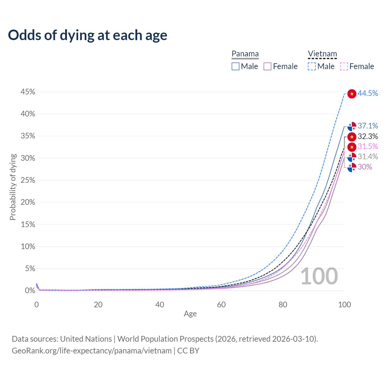 This life expectancy calculator shows the odds of living to 100, 95, 90, and below based on current age for both males and females in Panama and Vietnam, along with mean and median age of death. The calculations are based on the 2026 life tables (actuarial tables) from the UN World Population Prospects.