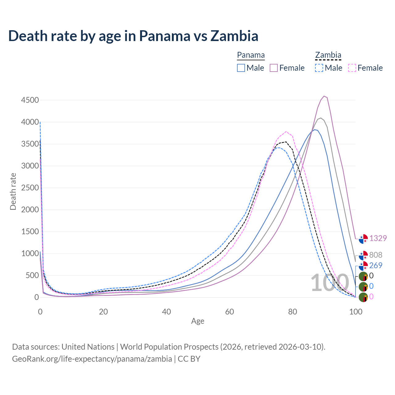 In Panama, the most common age of death is 89, compared to 0 in Zambia. The median age of death is 84.6 in Panama and 73.1 in Zambia, meaning only half of each cohort is expected to live past that age.
