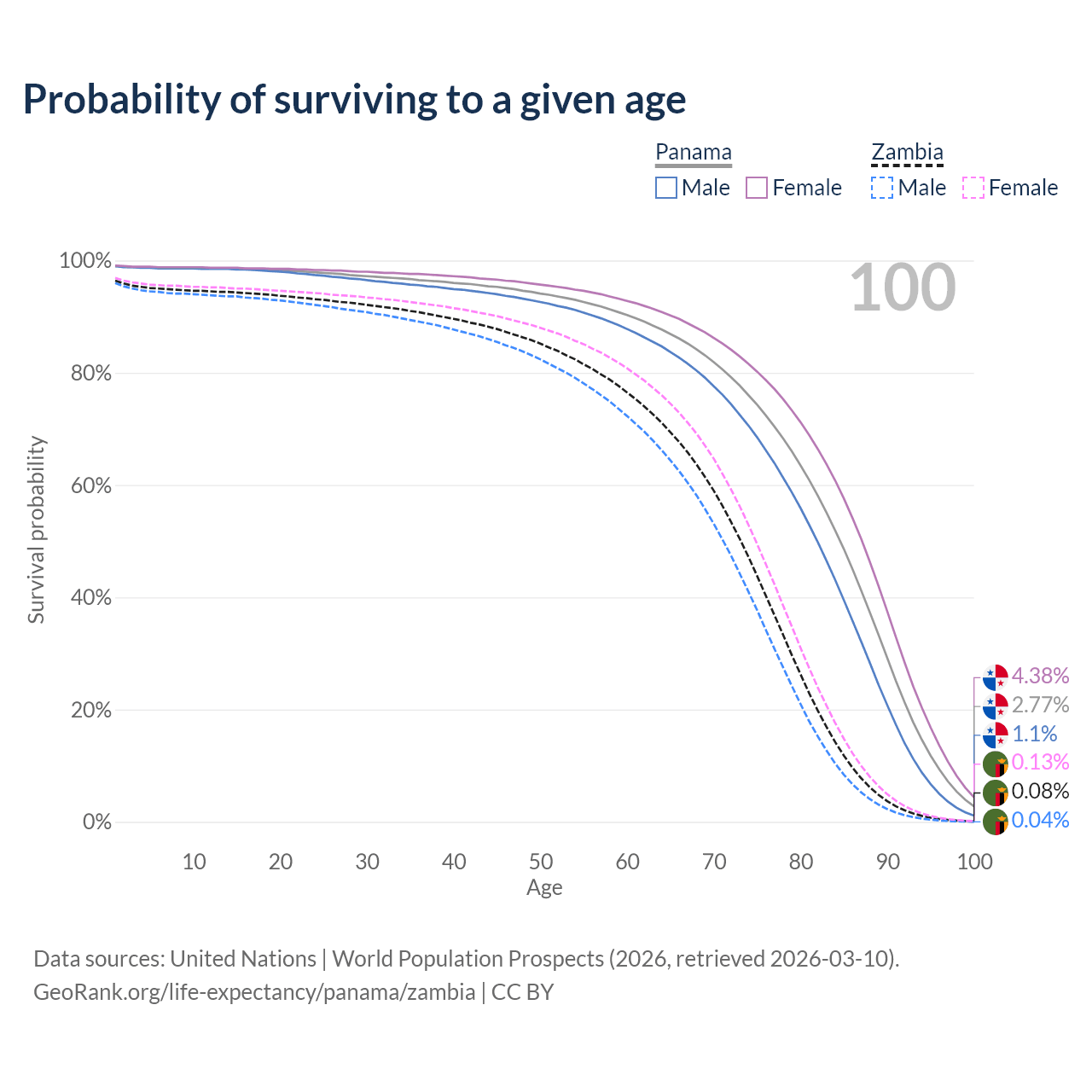 This life expectancy calculator shows the odds of living to 100, 95, 90, and below based on current age for both males and females in Panama and Zambia, along with mean and median age of death. The calculations are based on the 2026 life tables (actuarial tables) from the UN World Population Prospects.