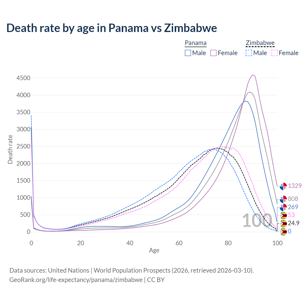 In Panama, the most common age of death is 89, compared to 0 in Zimbabwe. The median age of death is 84.6 in Panama and 68.8 in Zimbabwe, meaning only half of each cohort is expected to live past that age.