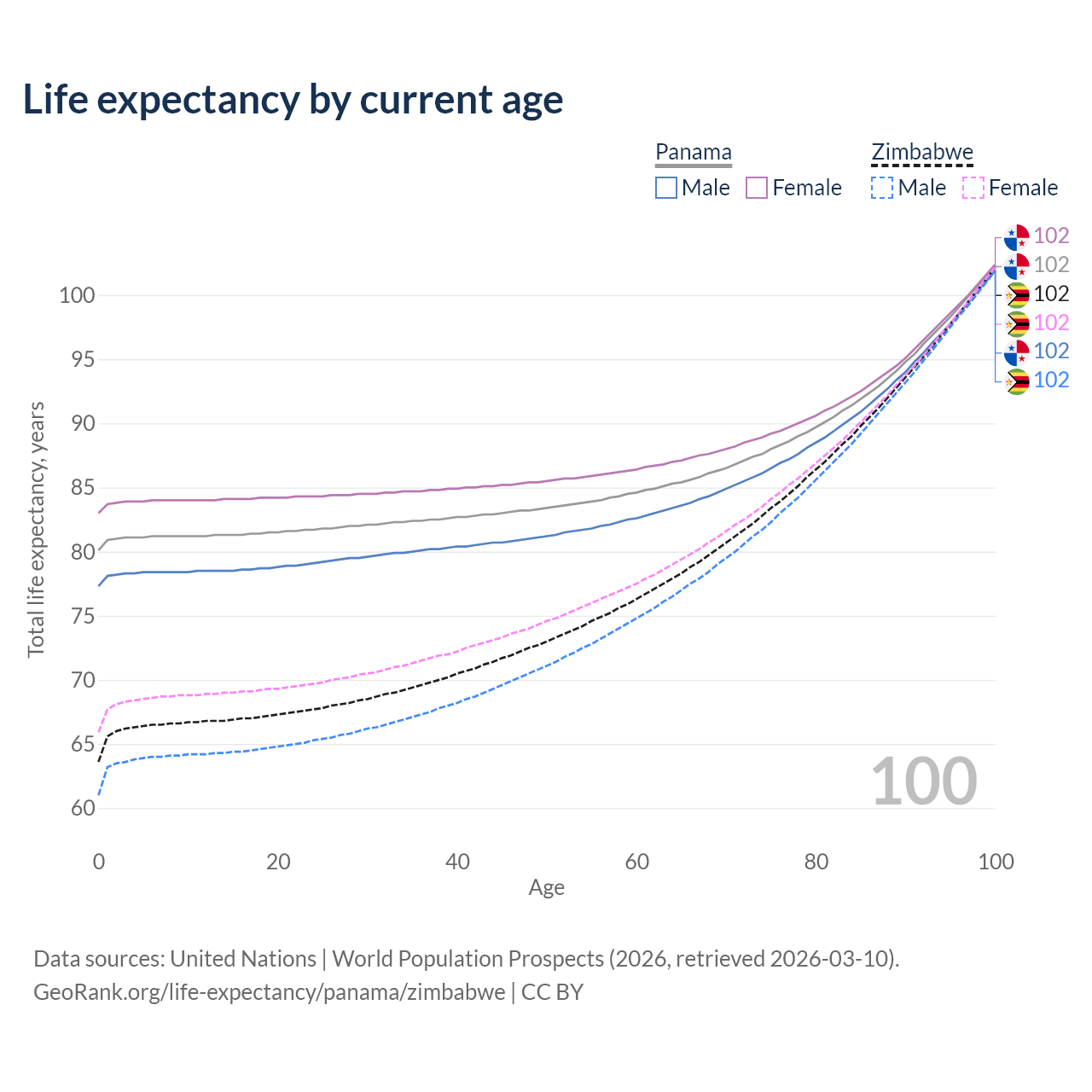 This life expectancy calculator shows the odds of living to 100, 95, 90, and below based on current age for both males and females in Panama and Zimbabwe, along with mean and median age of death. The calculations are based on the 2026 life tables (actuarial tables) from the UN World Population Prospects.