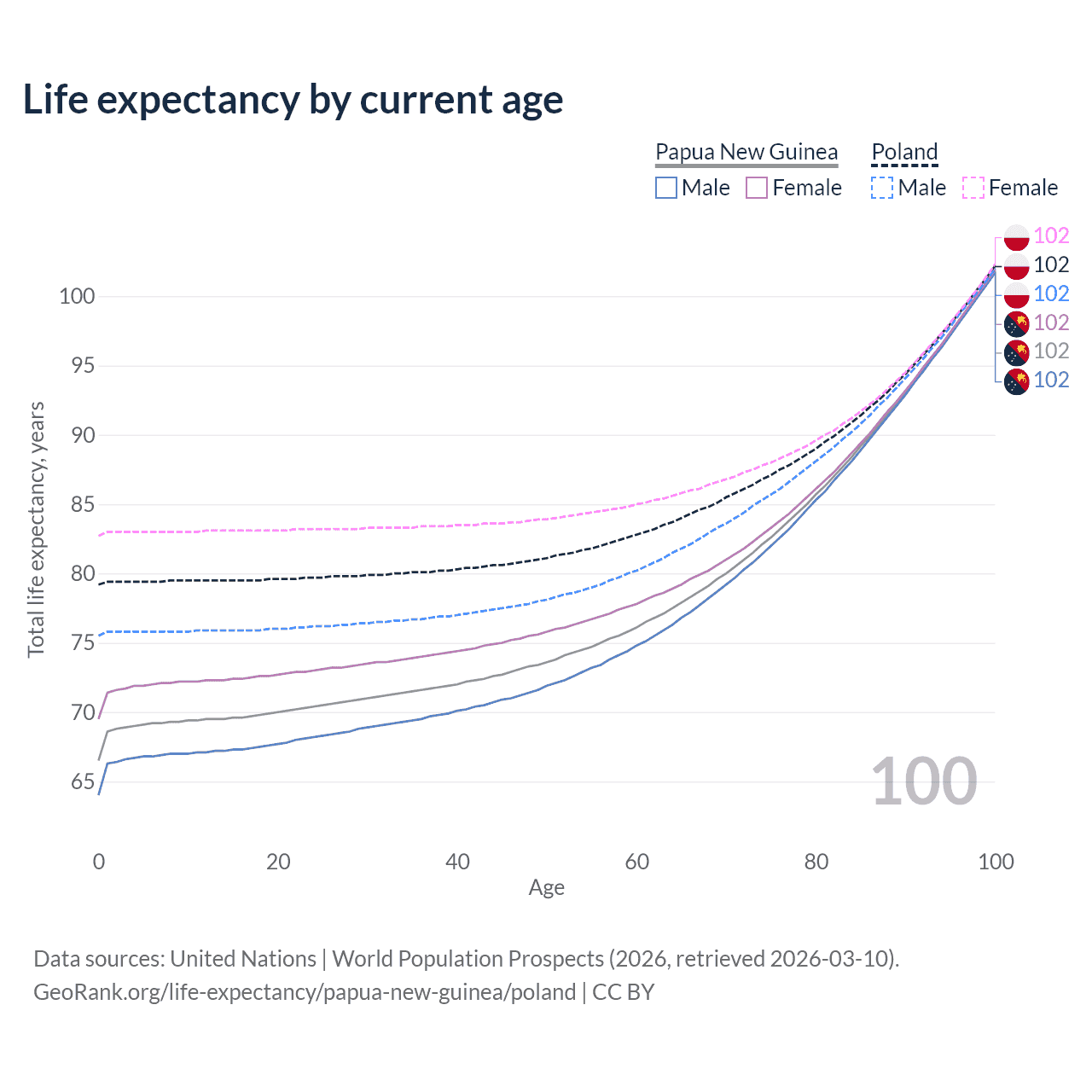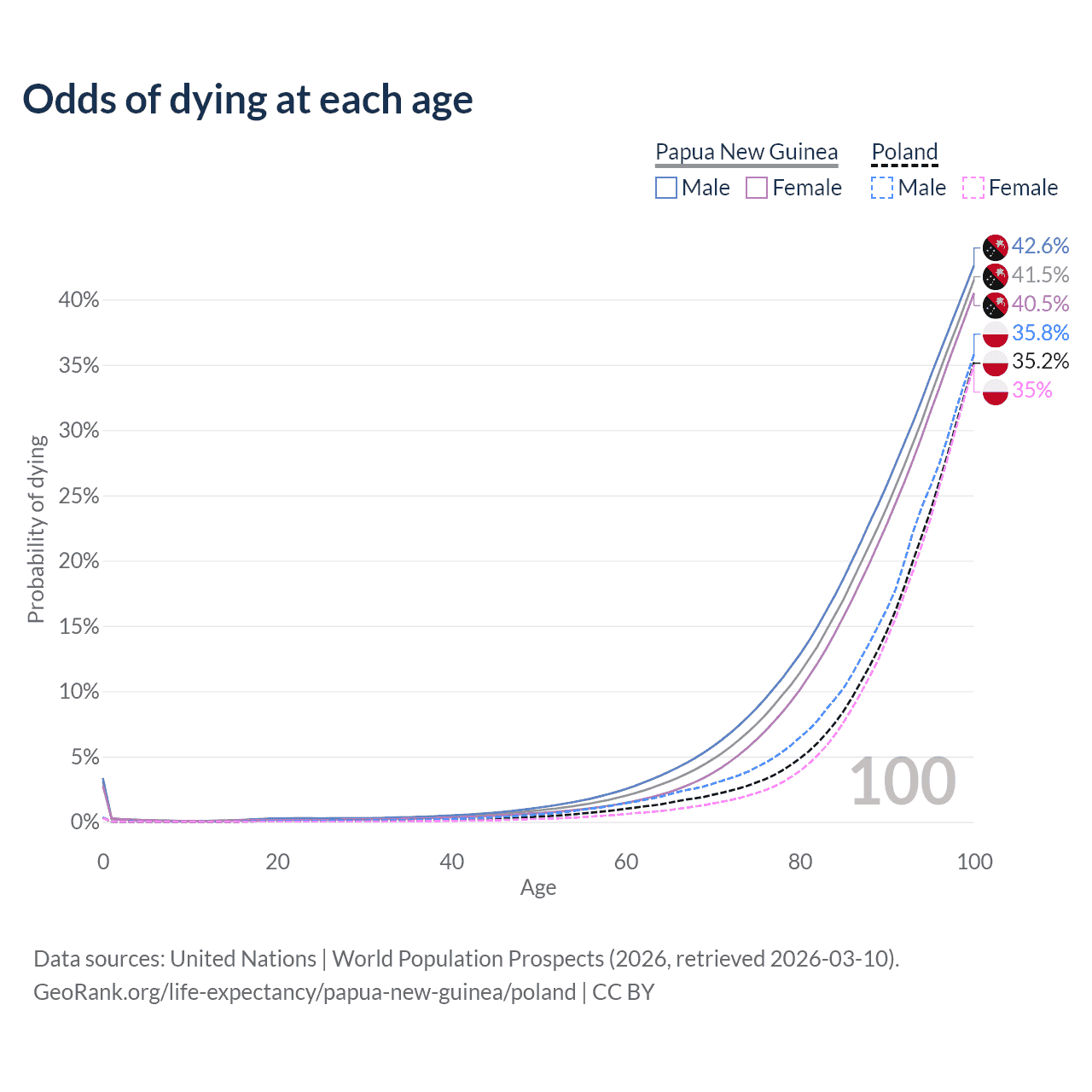 This life expectancy calculator shows the odds of living to 100, 95, 90, and below based on current age for both males and females in Papua New Guinea and Poland, along with mean and median age of death. The calculations are based on the 2026 life tables (actuarial tables) from the UN World Population Prospects.