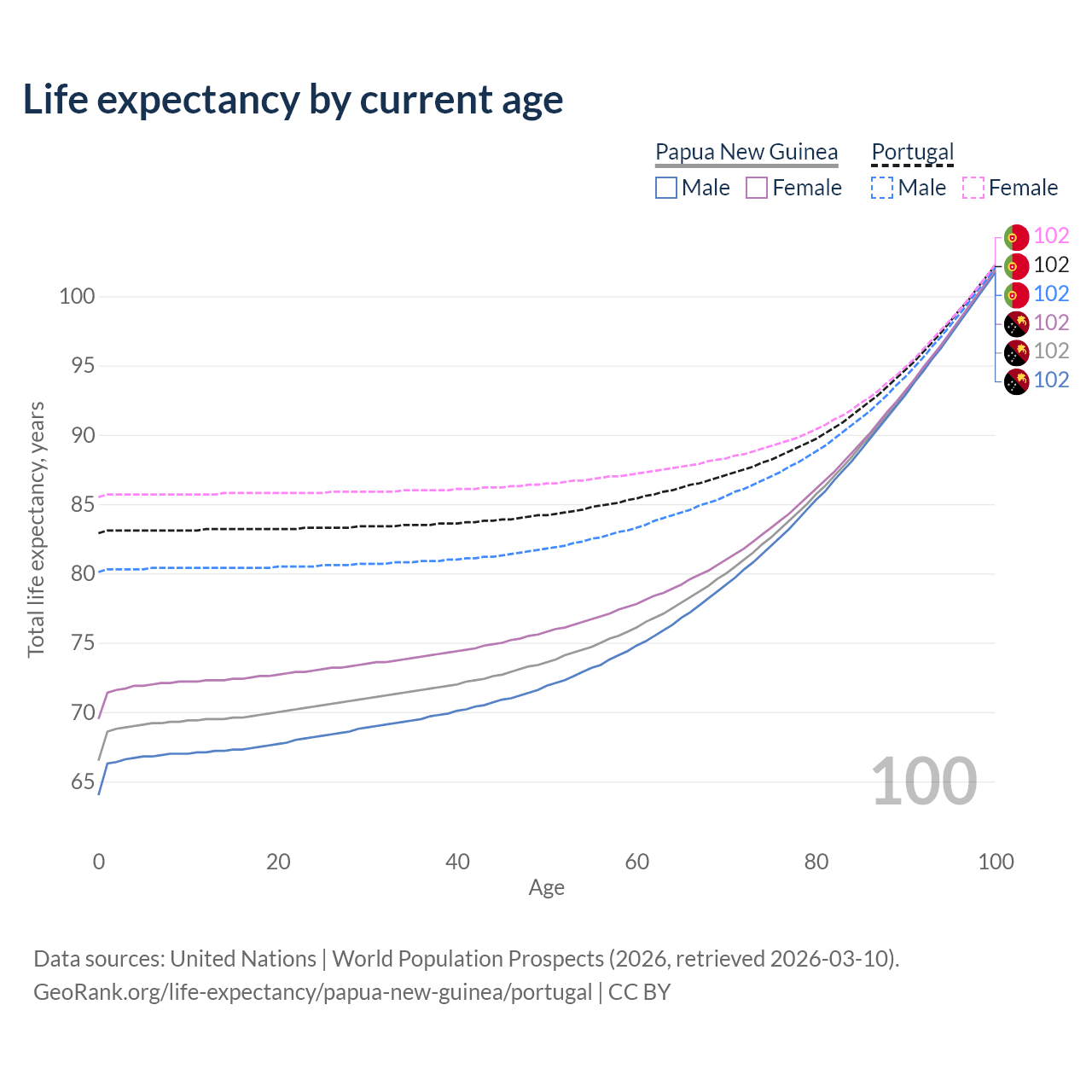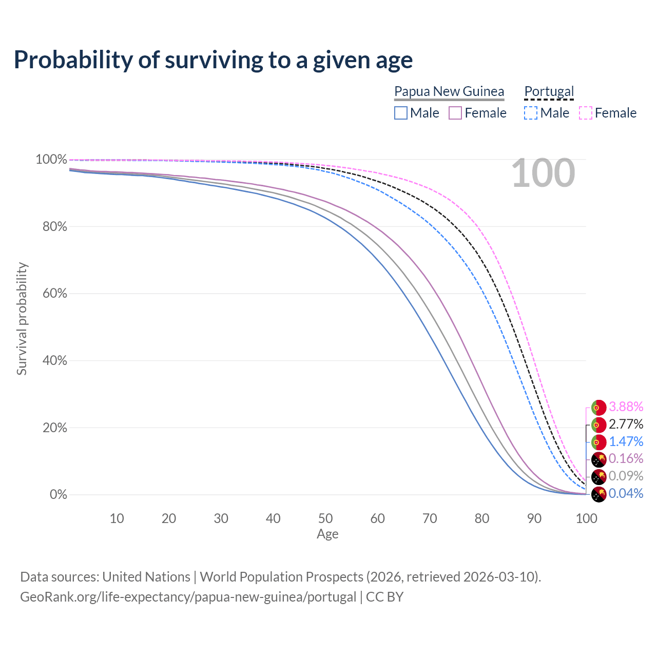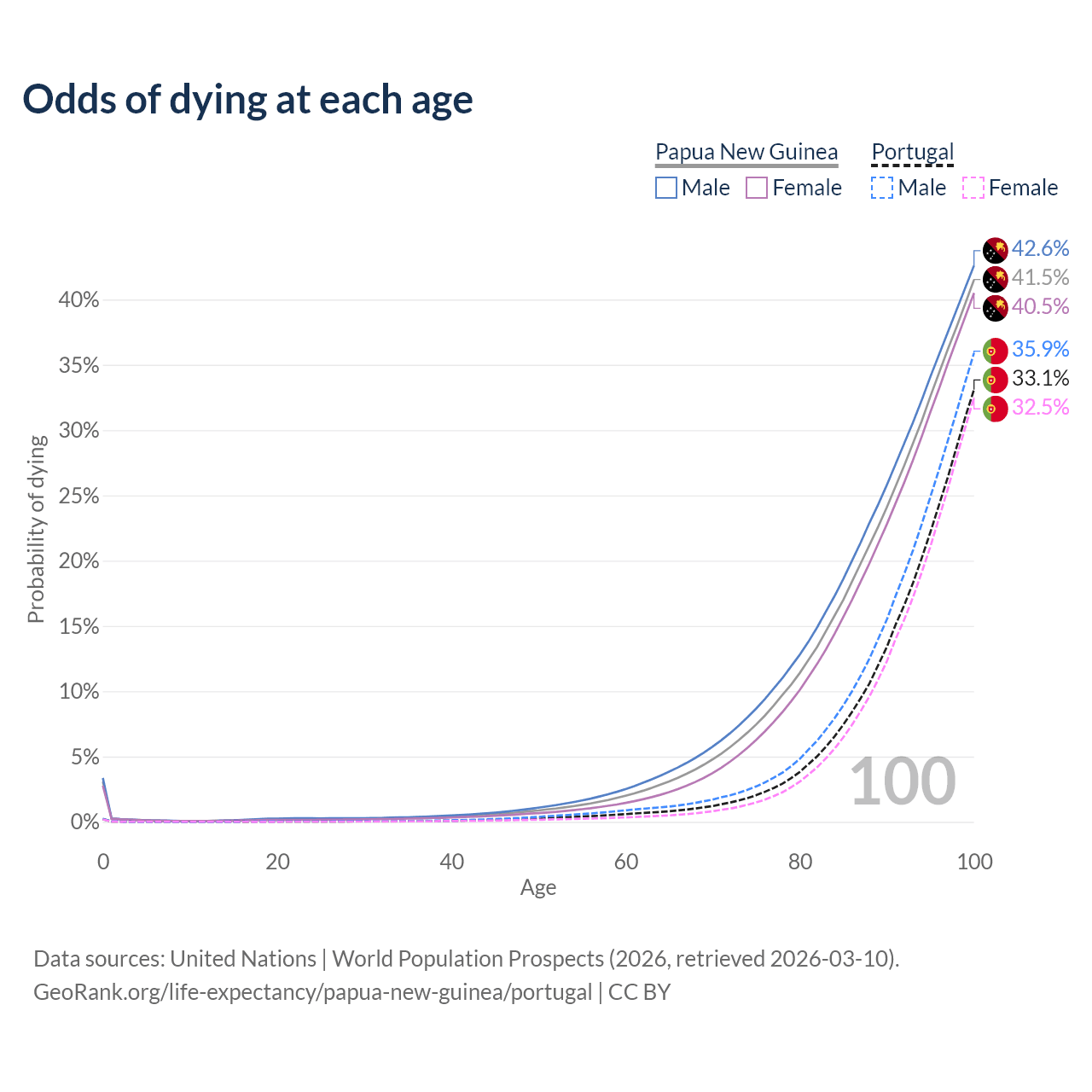This life expectancy calculator shows the odds of living to 100, 95, 90, and below based on current age for both males and females in Papua New Guinea and Portugal, along with mean and median age of death. The calculations are based on the 2026 life tables (actuarial tables) from the UN World Population Prospects.