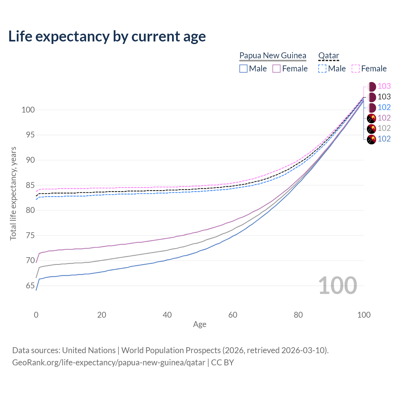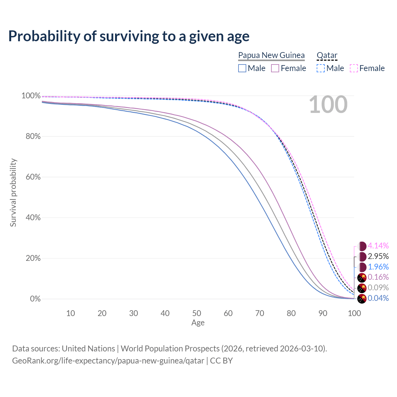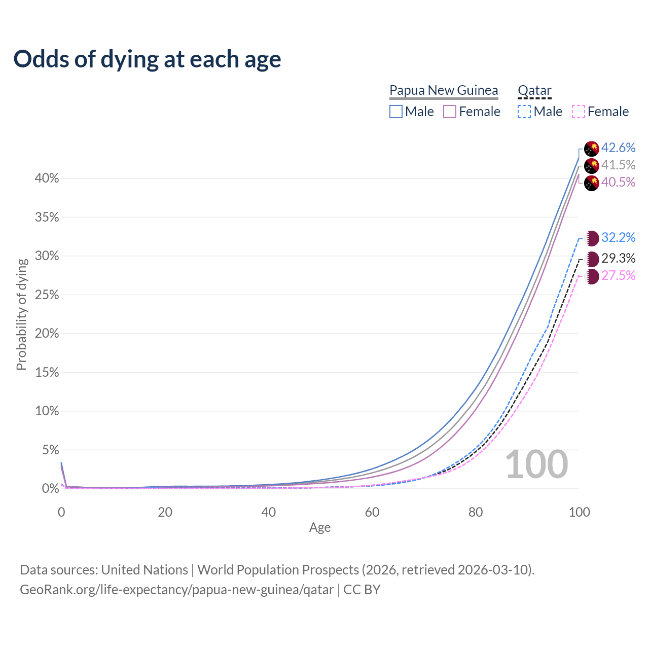 This life expectancy calculator shows the odds of living to 100, 95, 90, and below based on current age for both males and females in Papua New Guinea and Qatar, along with mean and median age of death. The calculations are based on the 2026 life tables (actuarial tables) from the UN World Population Prospects.