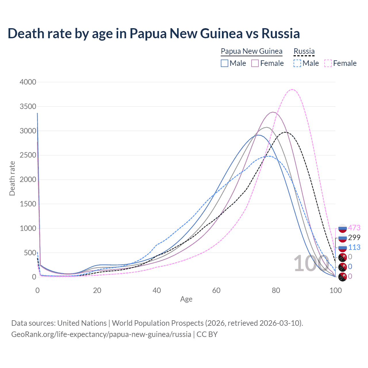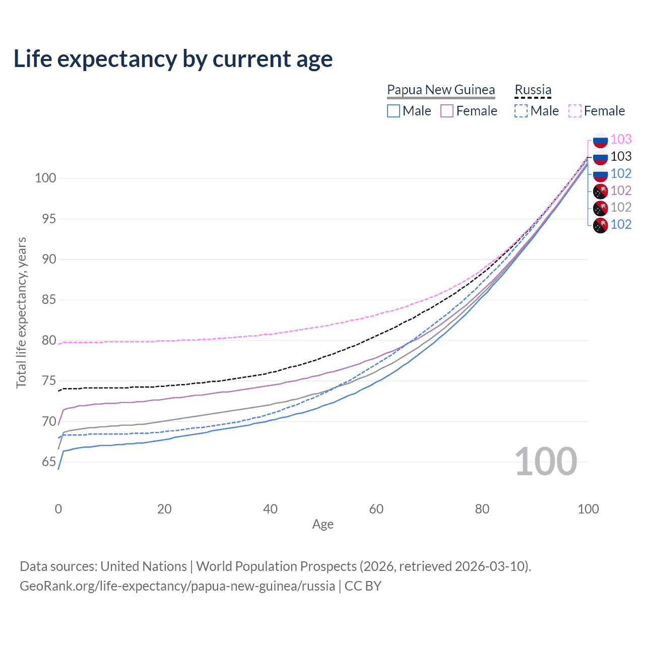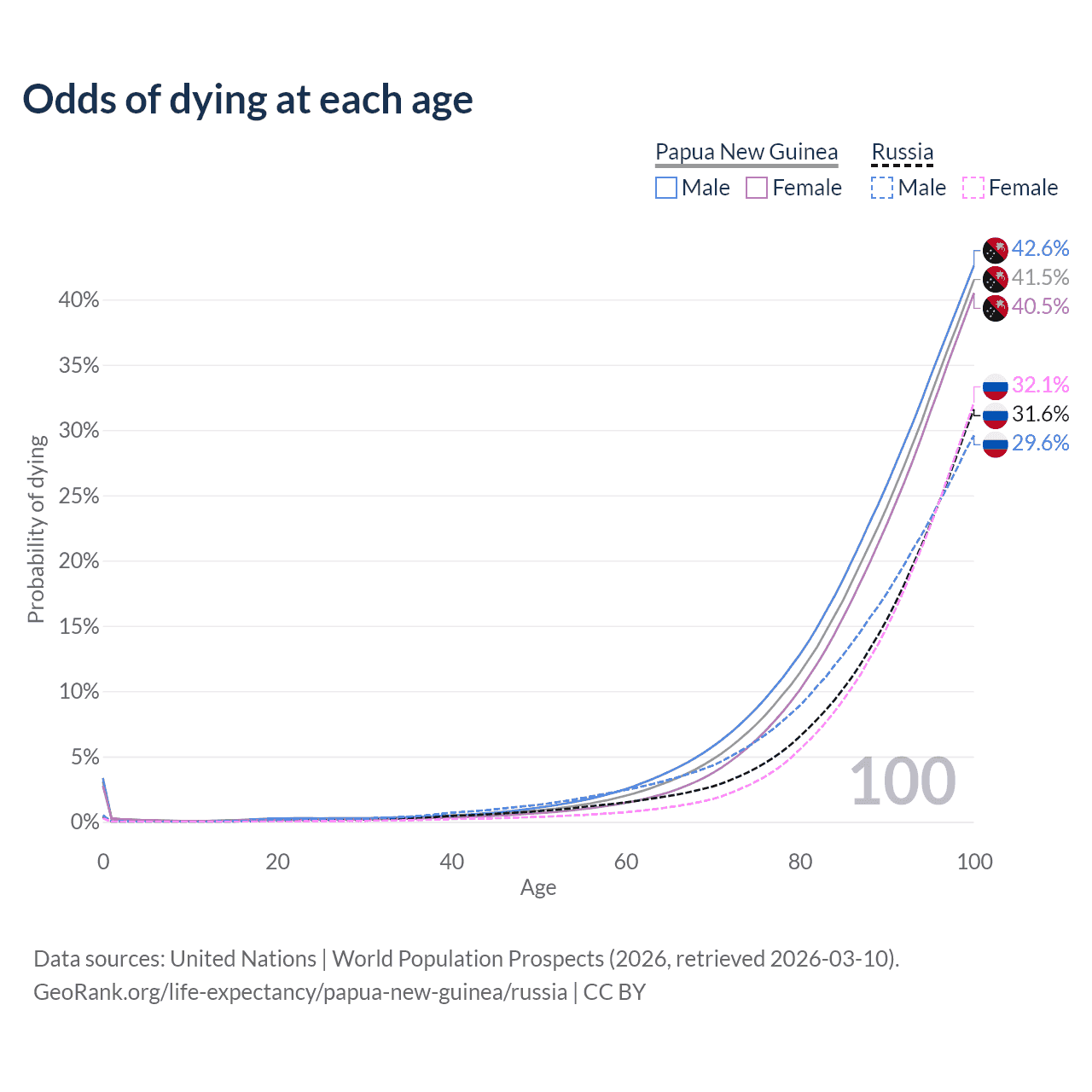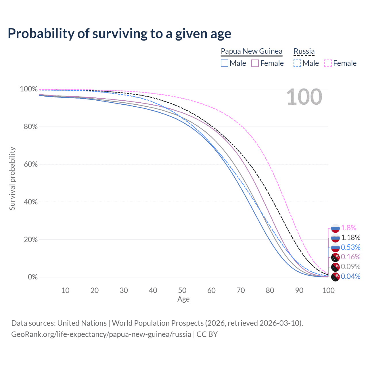 This life expectancy calculator shows the odds of living to 100, 95, 90, and below based on current age for both males and females in Papua New Guinea and Russia, along with mean and median age of death. The calculations are based on the 2026 life tables (actuarial tables) from the UN World Population Prospects.