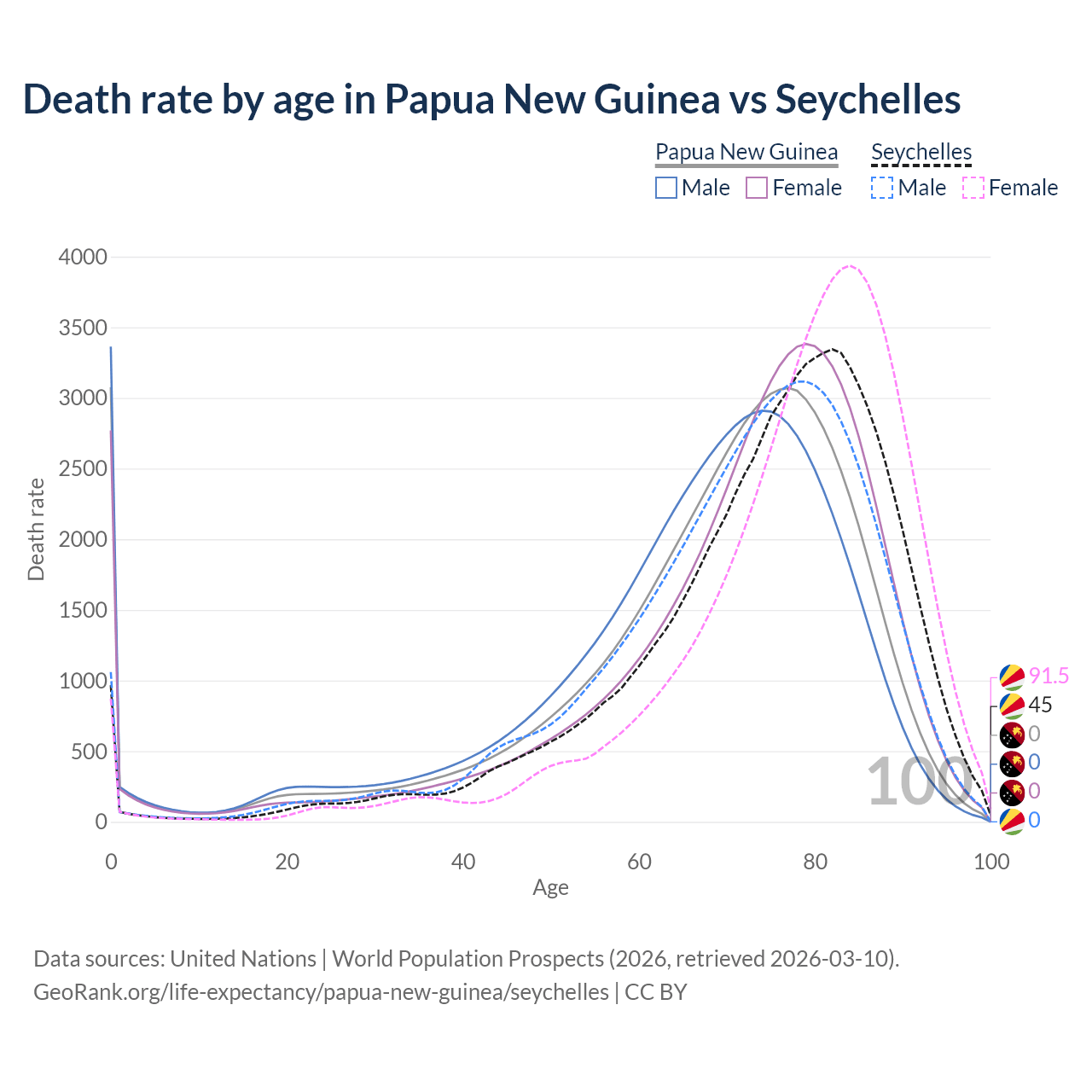 In Papua New Guinea, the most common age of death is 0, compared to 82 in the Seychelles. The median age of death is 71.7 in Papua New Guinea and 77 in the Seychelles, meaning only half of each cohort is expected to live past that age.
