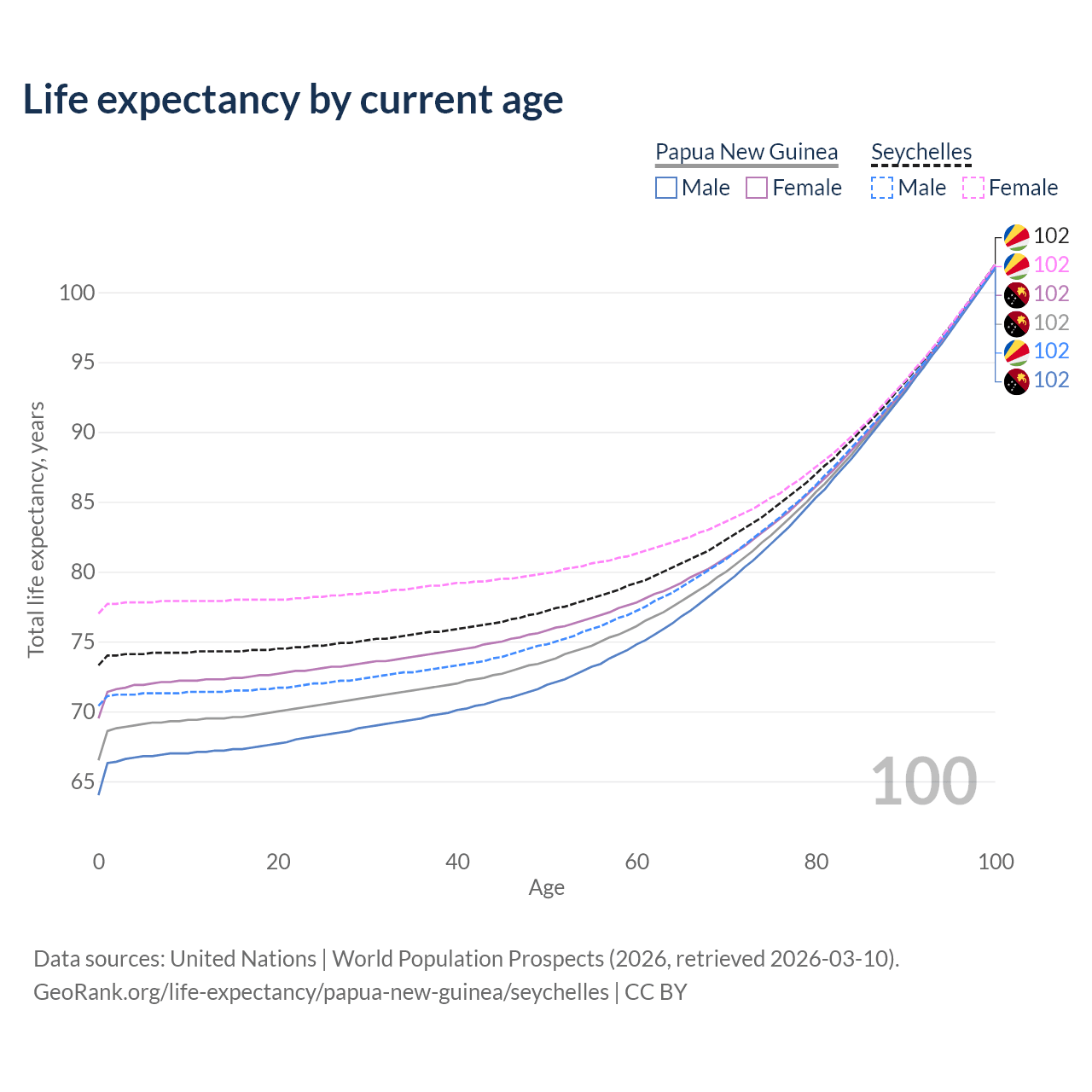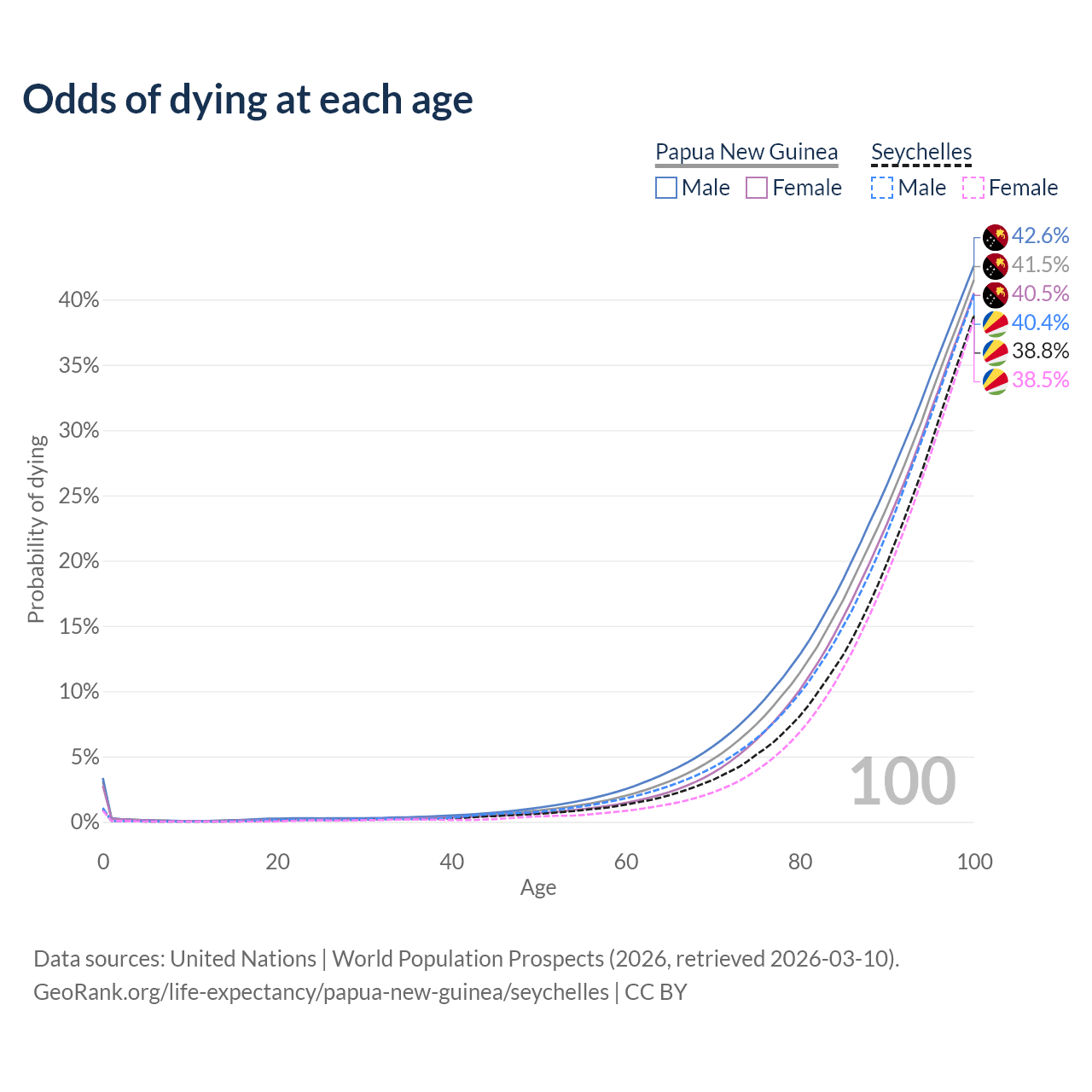 This life expectancy calculator shows the odds of living to 100, 95, 90, and below based on current age for both males and females in Papua New Guinea and the Seychelles, along with mean and median age of death. The calculations are based on the 2026 life tables (actuarial tables) from the UN World Population Prospects.