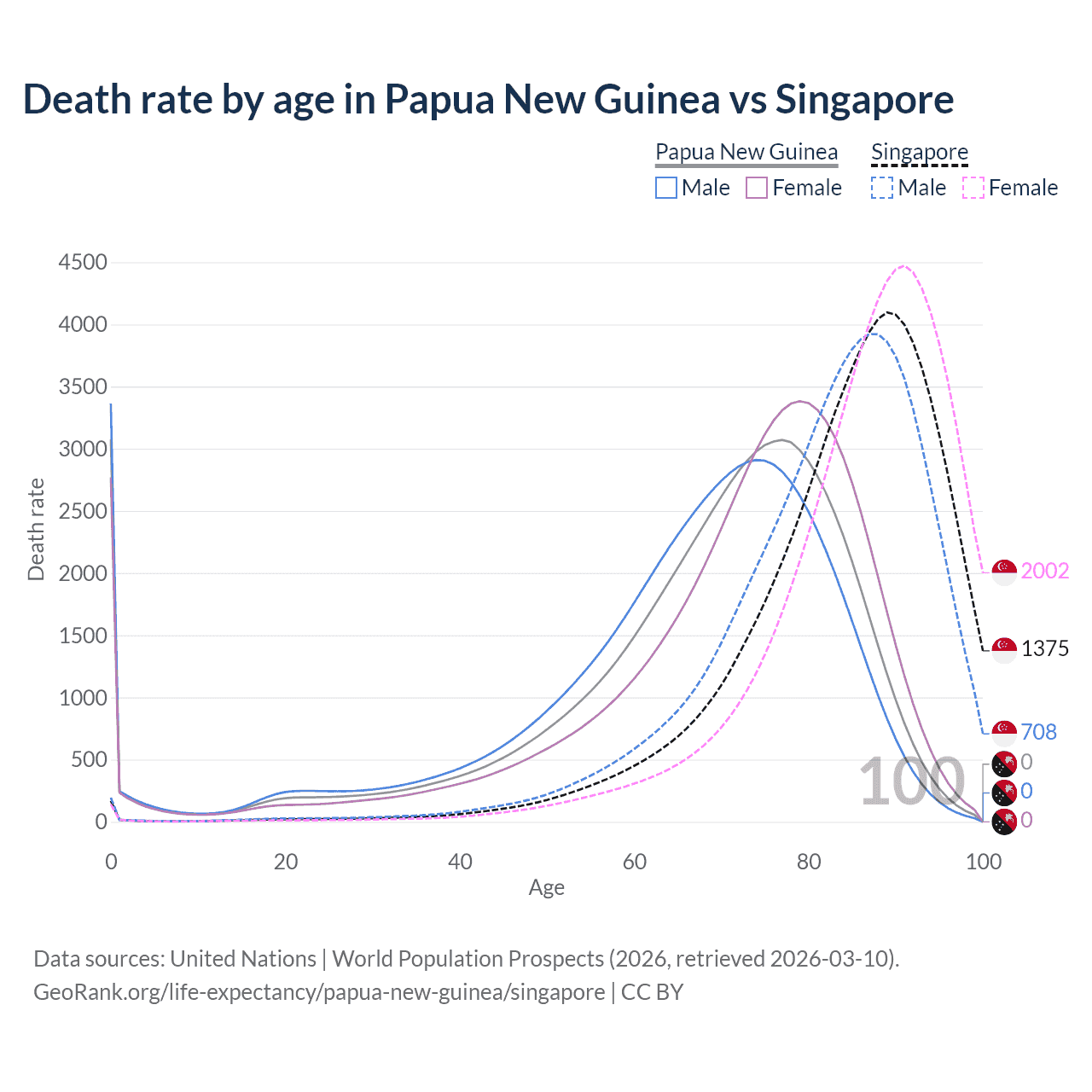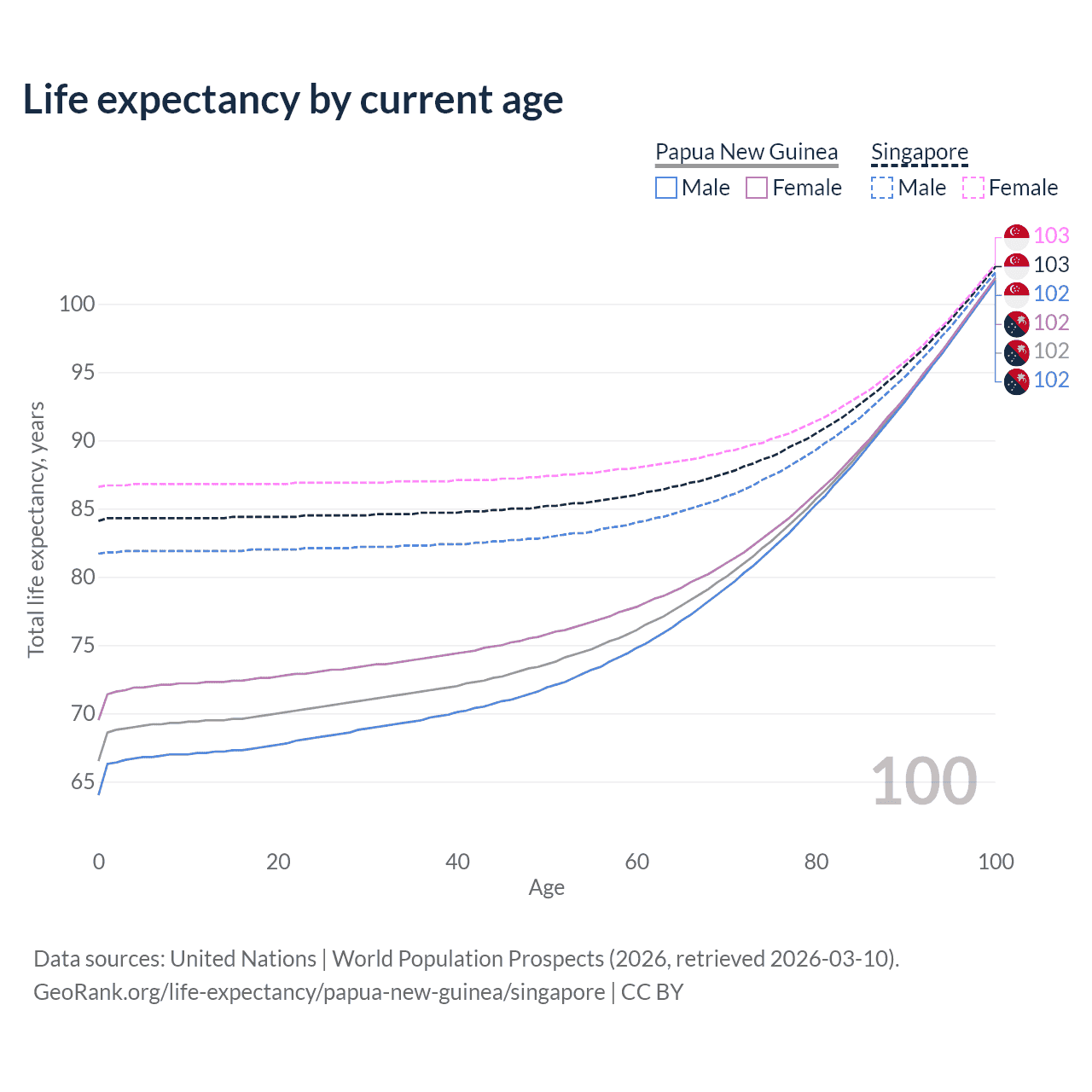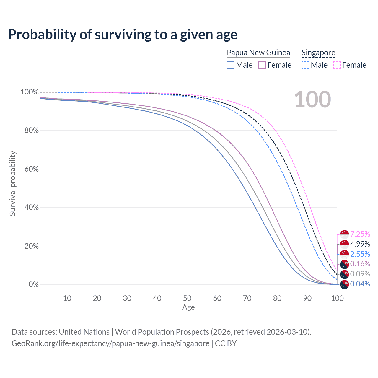This life expectancy calculator shows the odds of living to 100, 95, 90, and below based on current age for both males and females in Papua New Guinea and Singapore, along with mean and median age of death. The calculations are based on the 2026 life tables (actuarial tables) from the UN World Population Prospects.