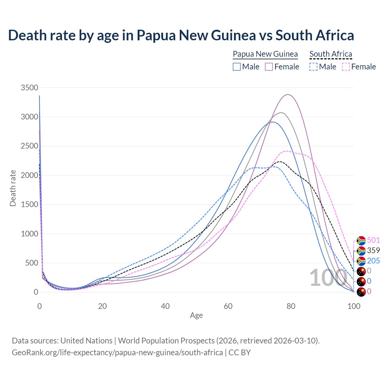 In Papua New Guinea, the most common age of death is 0, compared to 77 in South Africa. The median age of death is 71.7 in Papua New Guinea and 70.8 in South Africa, meaning only half of each cohort is expected to live past that age.
