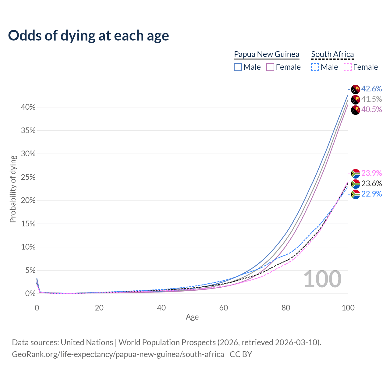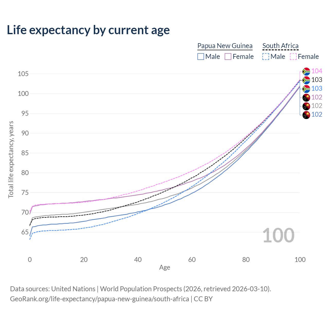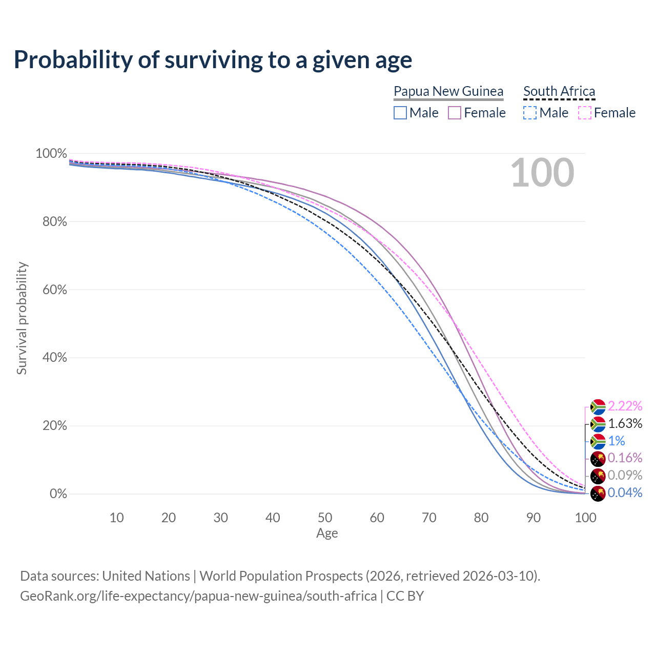 This life expectancy calculator shows the odds of living to 100, 95, 90, and below based on current age for both males and females in Papua New Guinea and South Africa, along with mean and median age of death. The calculations are based on the 2026 life tables (actuarial tables) from the UN World Population Prospects.