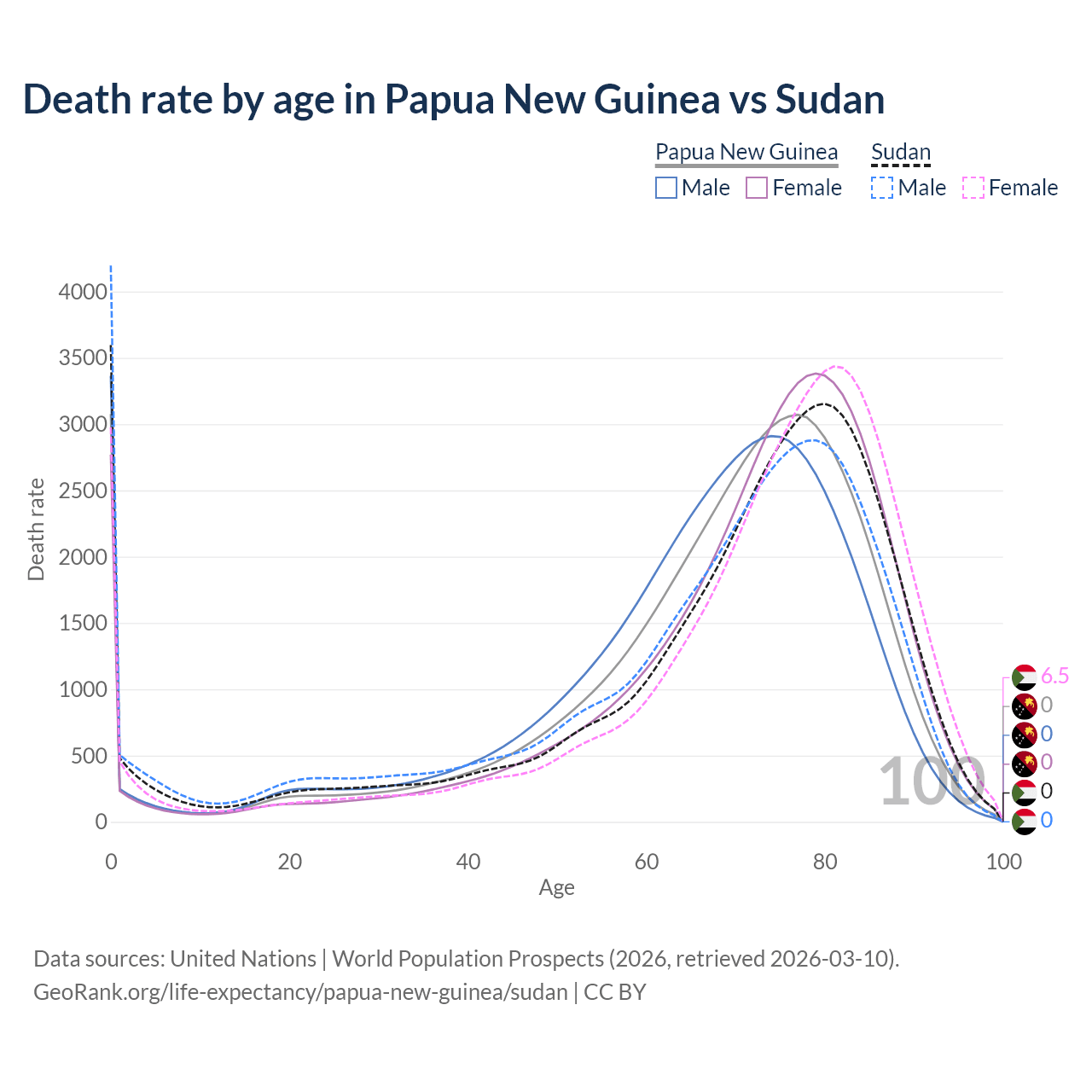 In Papua New Guinea, the most common age of death is 0, compared to 0 in Sudan. The median age of death is 71.7 in Papua New Guinea and 74.1 in Sudan, meaning only half of each cohort is expected to live past that age.