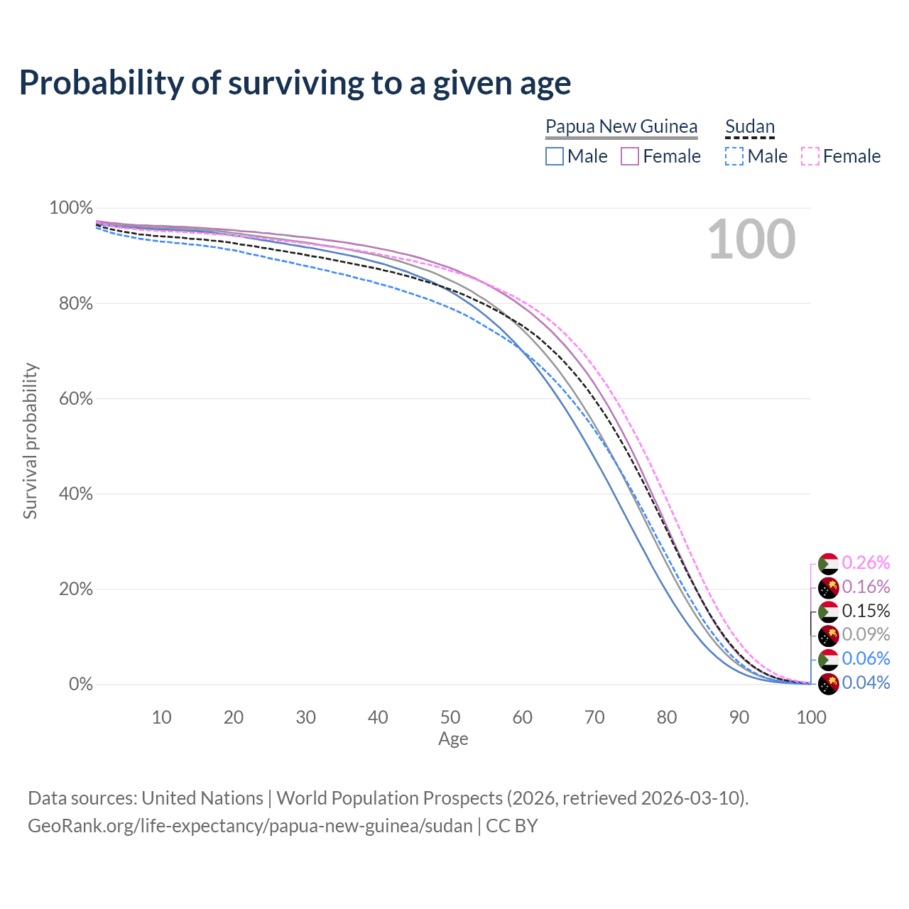 This life expectancy calculator shows the odds of living to 100, 95, 90, and below based on current age for both males and females in Papua New Guinea and Sudan, along with mean and median age of death. The calculations are based on the 2026 life tables (actuarial tables) from the UN World Population Prospects.