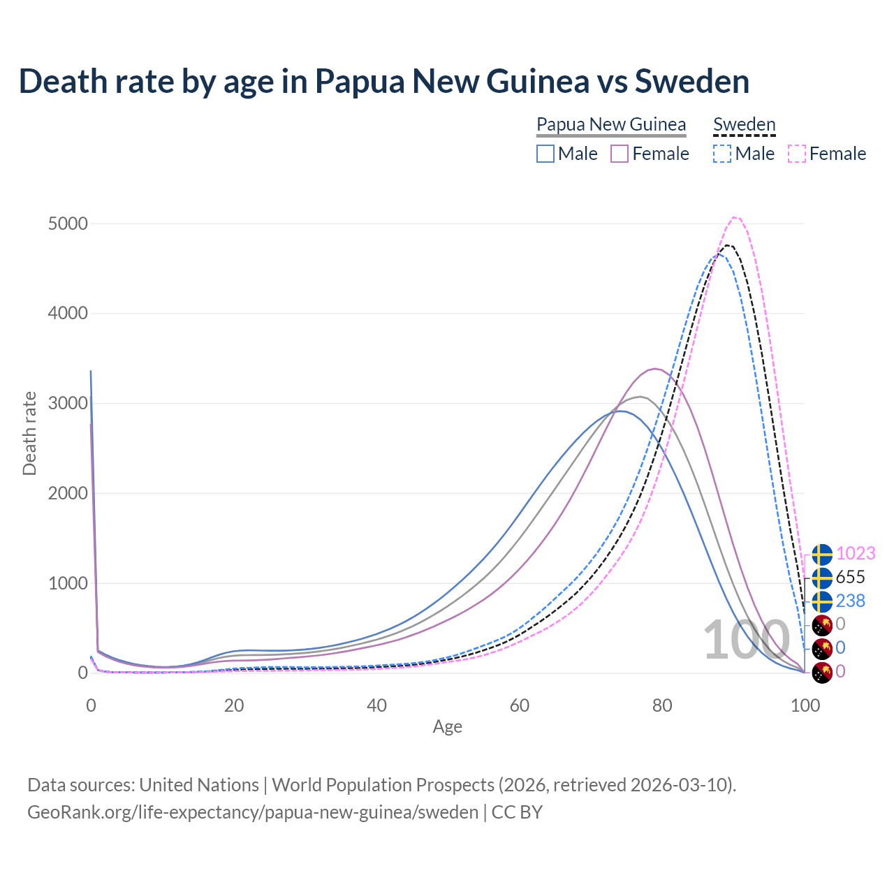 In Papua New Guinea, the most common age of death is 0, compared to 89 in Sweden. The median age of death is 71.7 in Papua New Guinea and 86.5 in Sweden, meaning only half of each cohort is expected to live past that age.