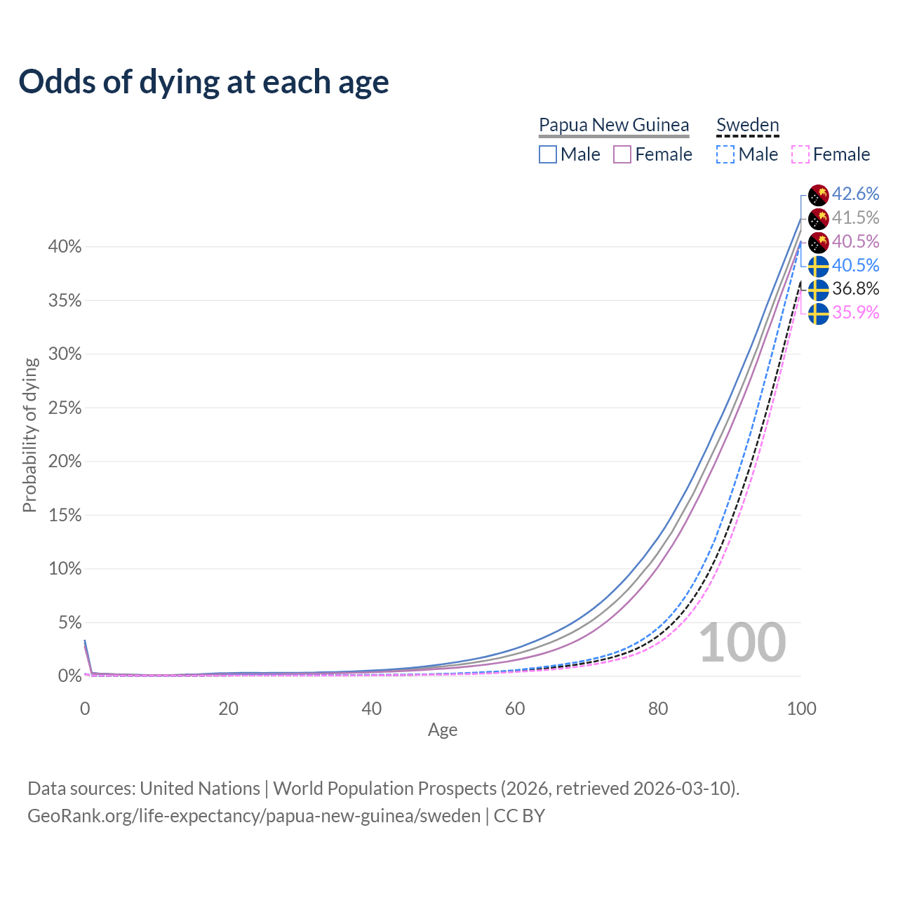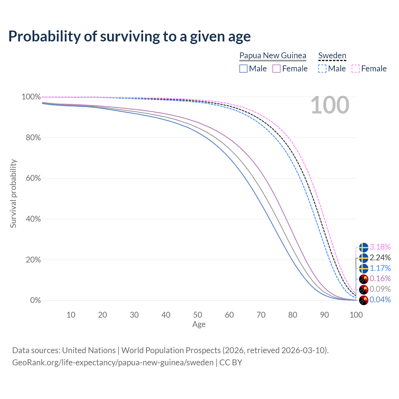 This life expectancy calculator shows the odds of living to 100, 95, 90, and below based on current age for both males and females in Papua New Guinea and Sweden, along with mean and median age of death. The calculations are based on the 2026 life tables (actuarial tables) from the UN World Population Prospects.