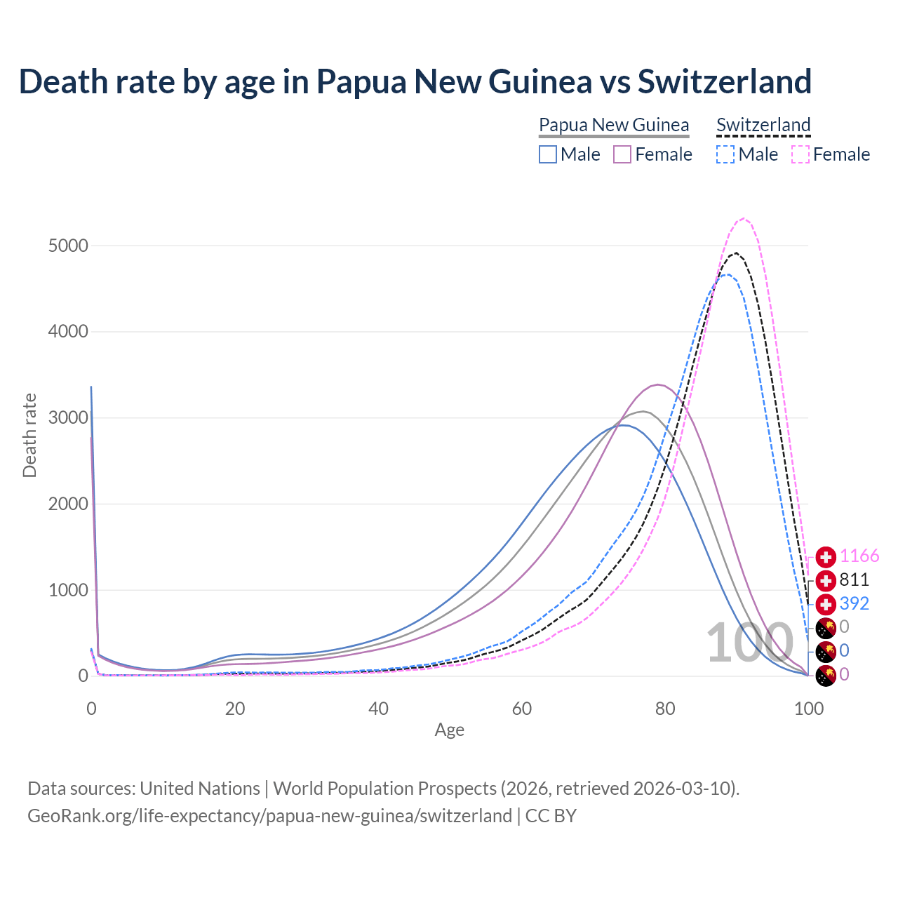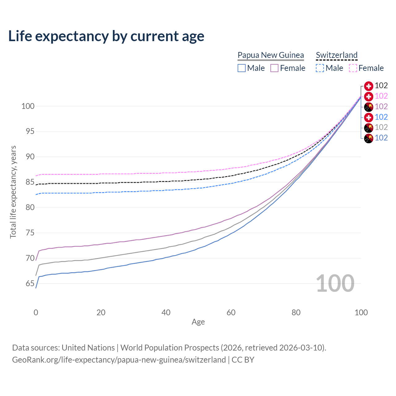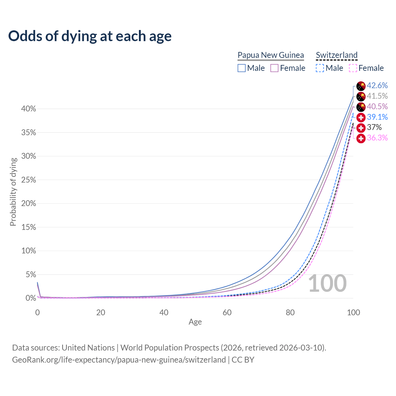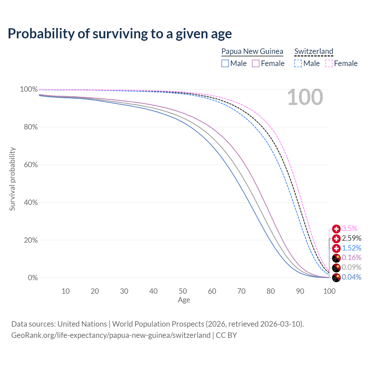 This life expectancy calculator shows the odds of living to 100, 95, 90, and below based on current age for both males and females in Papua New Guinea and Switzerland, along with mean and median age of death. The calculations are based on the 2026 life tables (actuarial tables) from the UN World Population Prospects.