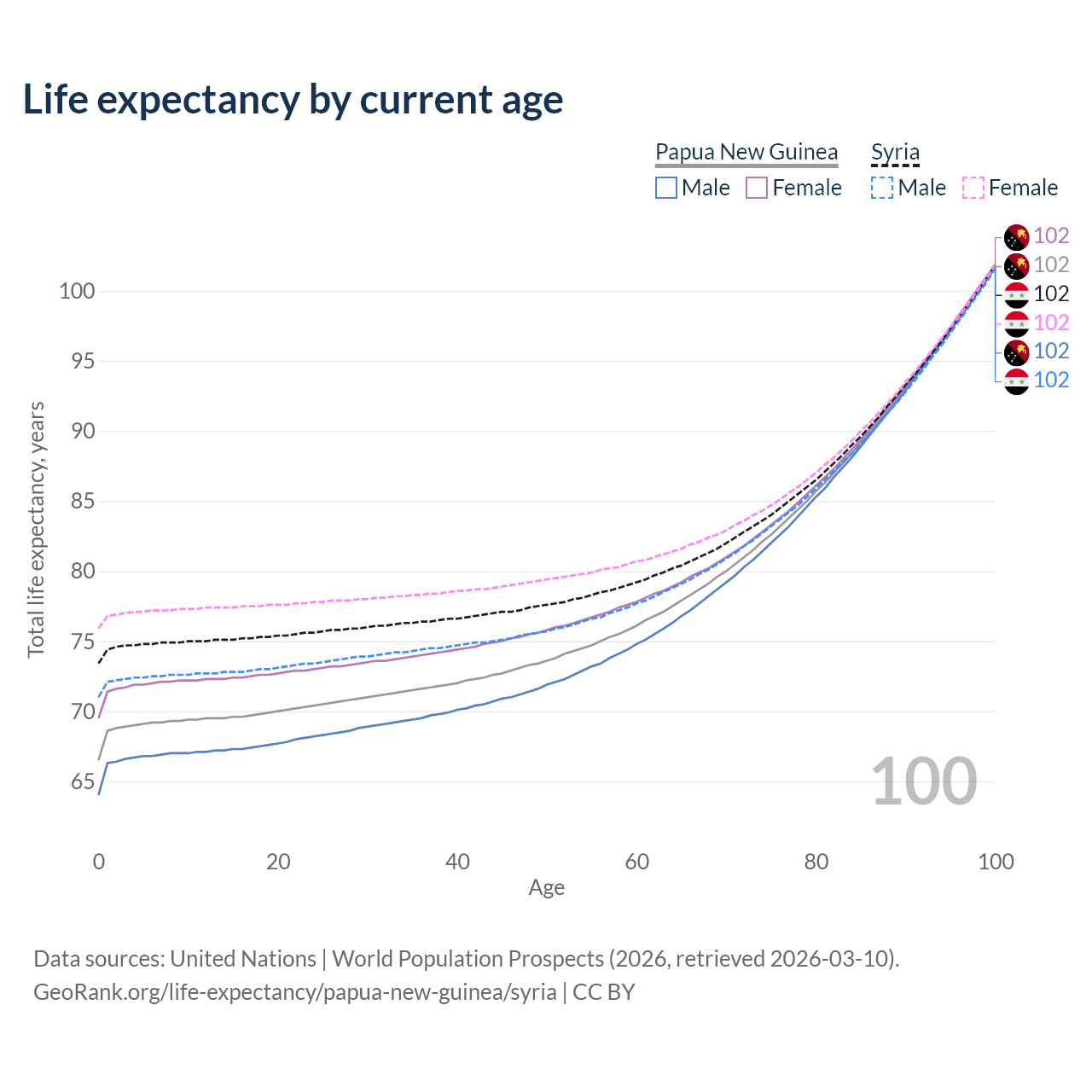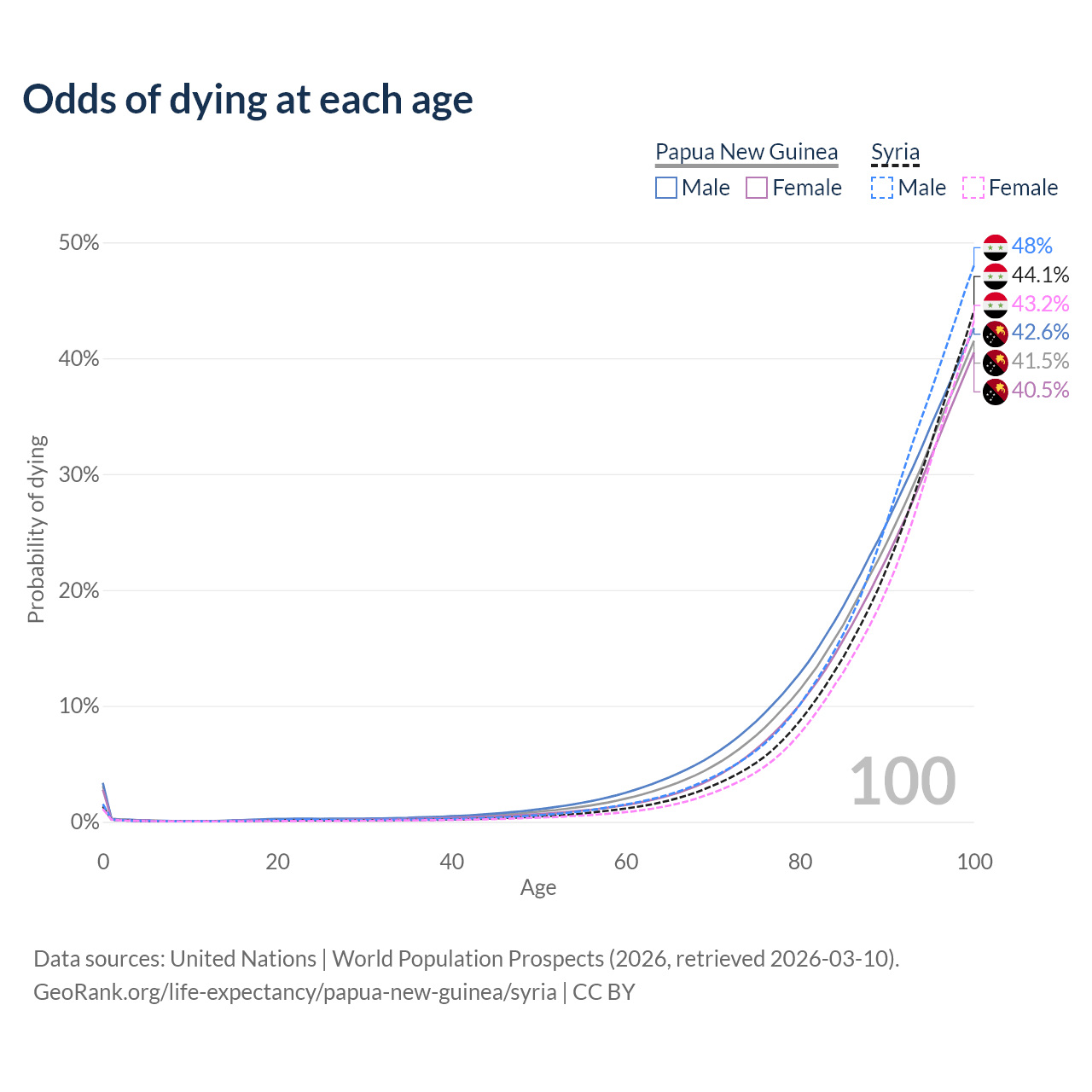This life expectancy calculator shows the odds of living to 100, 95, 90, and below based on current age for both males and females in Papua New Guinea and Syria, along with mean and median age of death. The calculations are based on the 2026 life tables (actuarial tables) from the UN World Population Prospects.