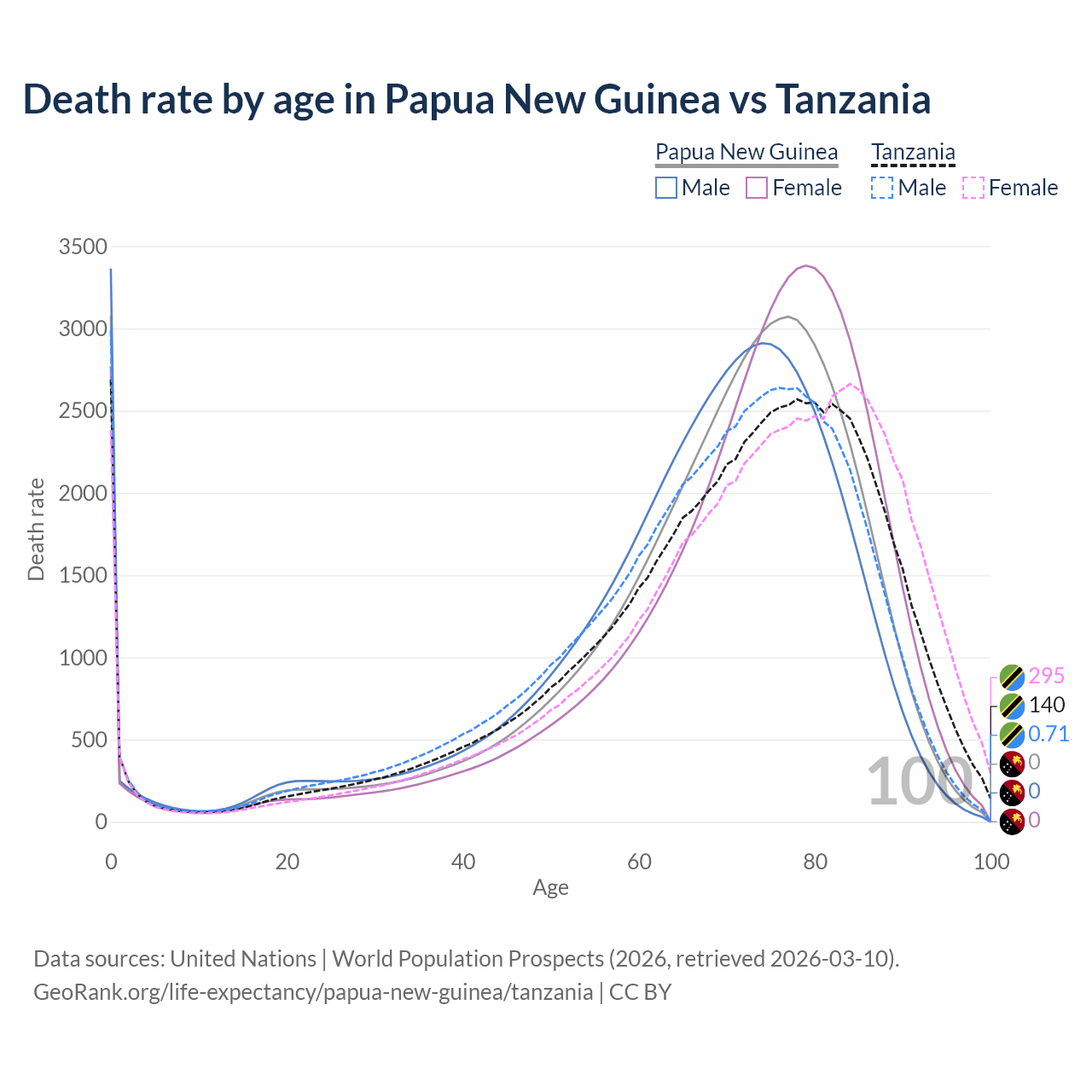 In Papua New Guinea, the most common age of death is 0, compared to 0 in Tanzania. The median age of death is 71.7 in Papua New Guinea and 72.6 in Tanzania, meaning only half of each cohort is expected to live past that age.