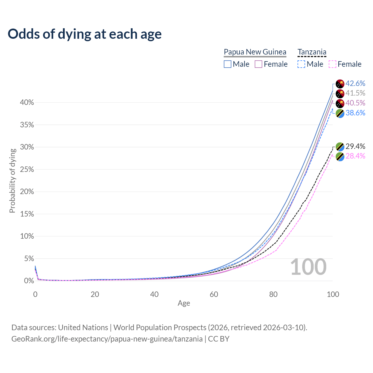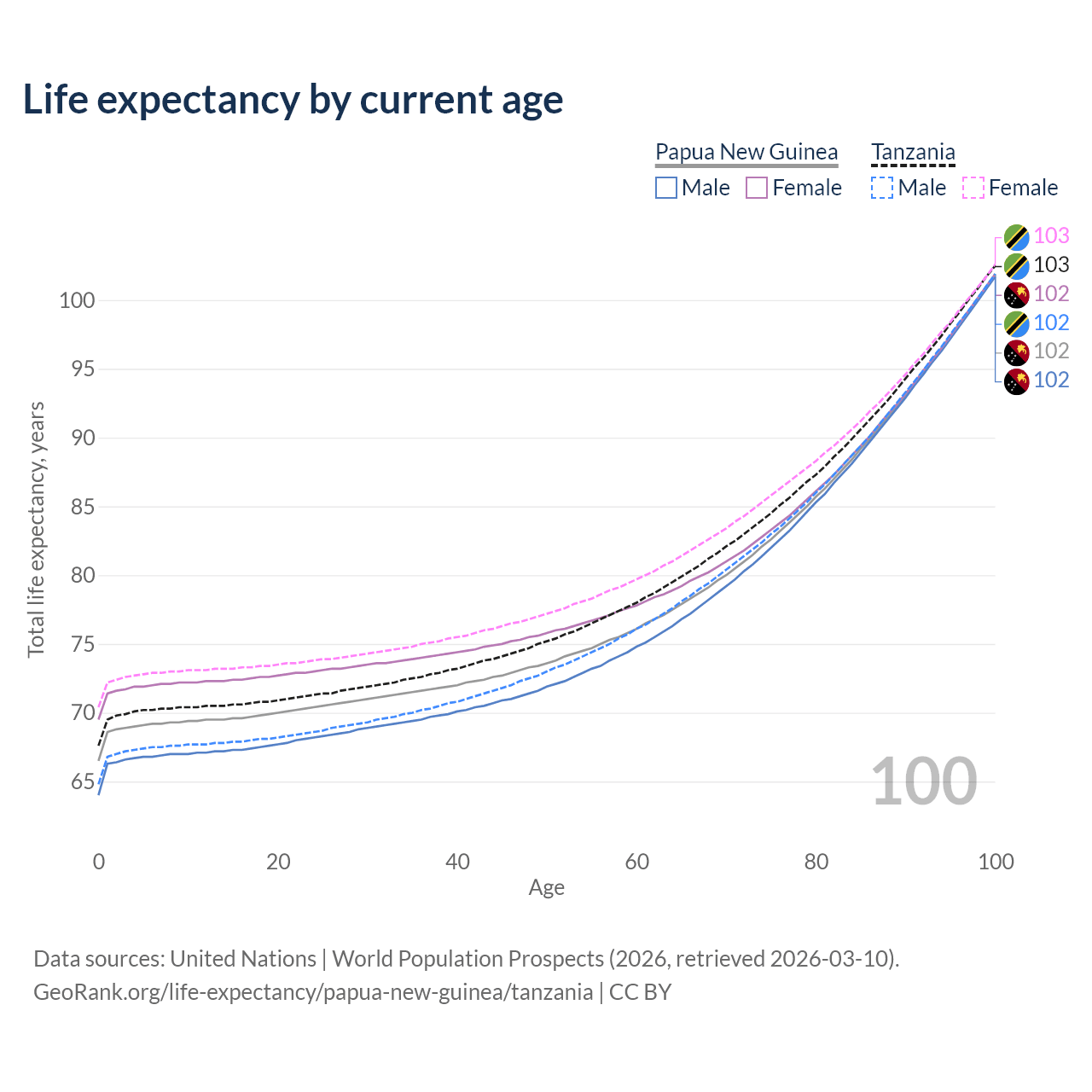 This life expectancy calculator shows the odds of living to 100, 95, 90, and below based on current age for both males and females in Papua New Guinea and Tanzania, along with mean and median age of death. The calculations are based on the 2026 life tables (actuarial tables) from the UN World Population Prospects.