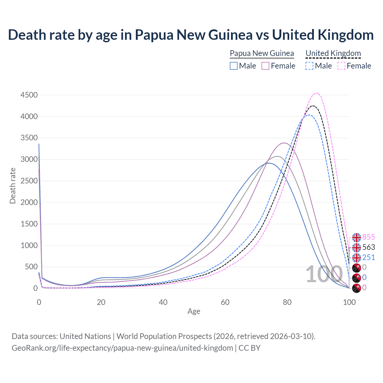 In Papua New Guinea, the most common age of death is 0, compared to 88 in the United Kingdom. The median age of death is 71.7 in Papua New Guinea and 84.9 in the United Kingdom, meaning only half of each cohort is expected to live past that age.
