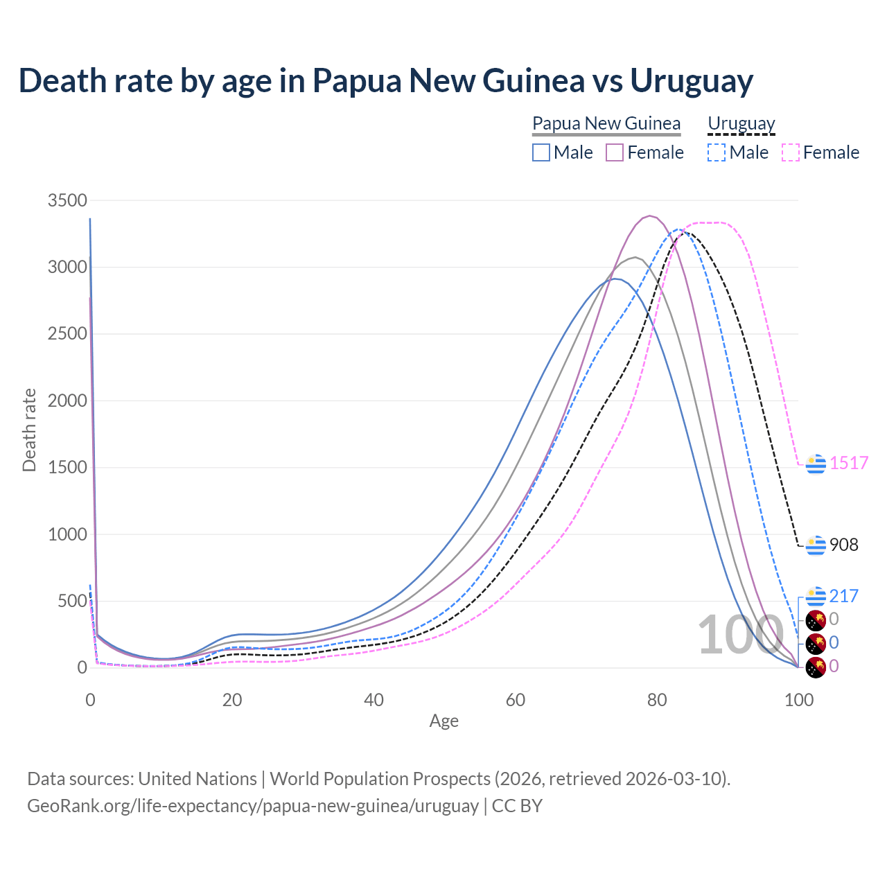 In Papua New Guinea, the most common age of death is 0, compared to 84 in Uruguay. The median age of death is 71.7 in Papua New Guinea and 81.8 in Uruguay, meaning only half of each cohort is expected to live past that age.