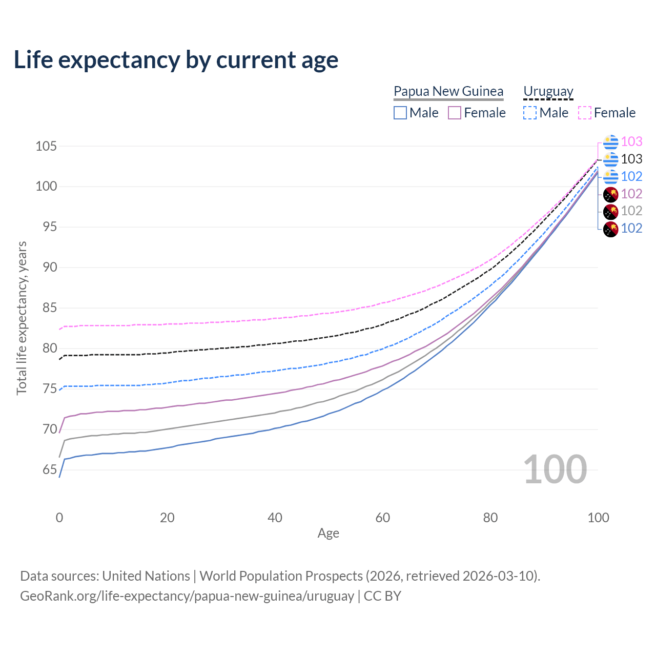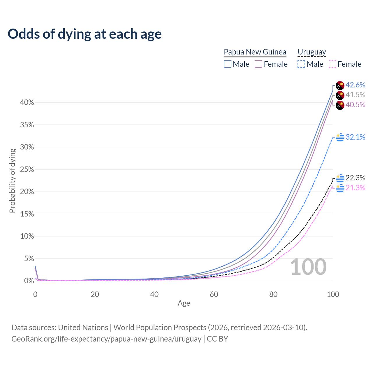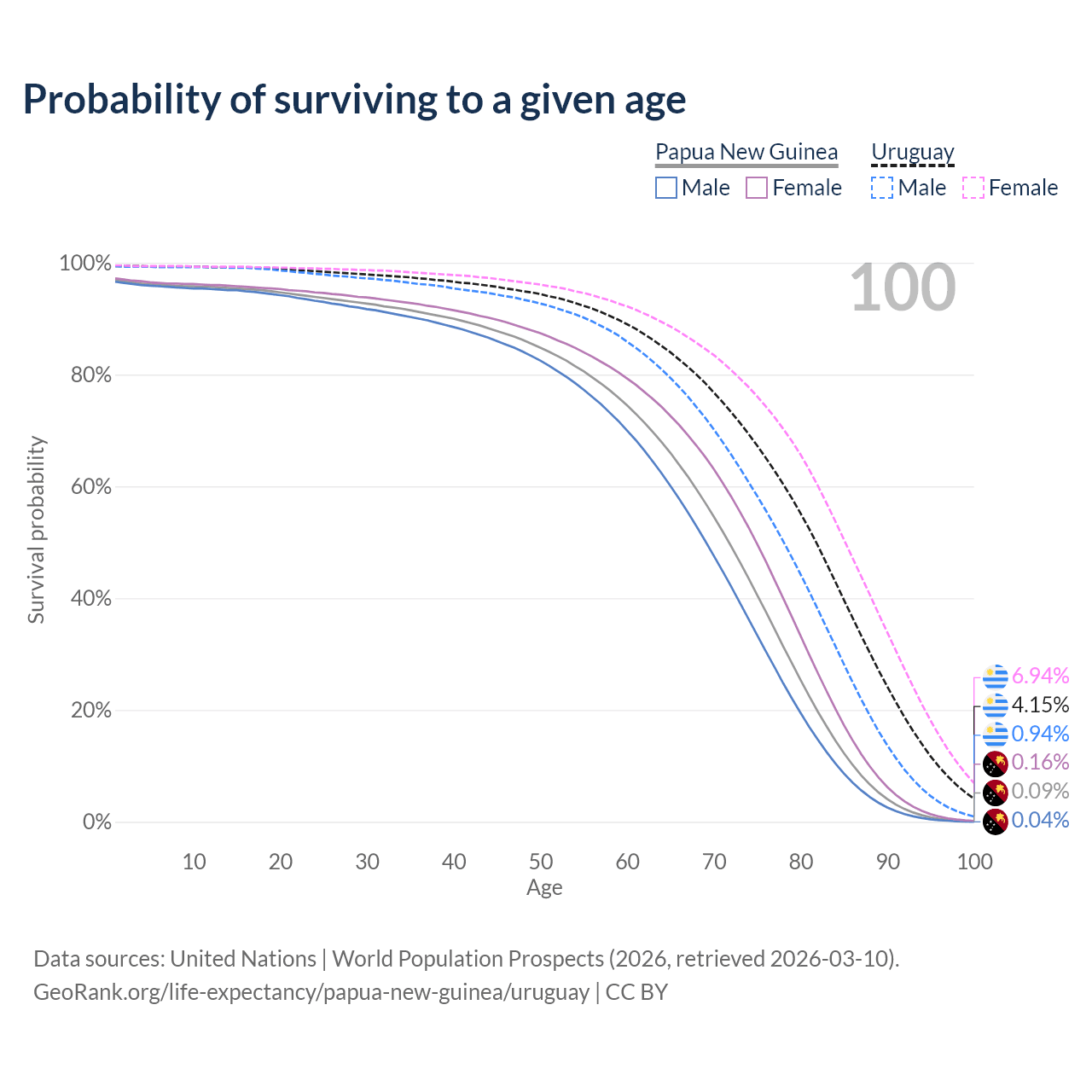 This life expectancy calculator shows the odds of living to 100, 95, 90, and below based on current age for both males and females in Papua New Guinea and Uruguay, along with mean and median age of death. The calculations are based on the 2026 life tables (actuarial tables) from the UN World Population Prospects.