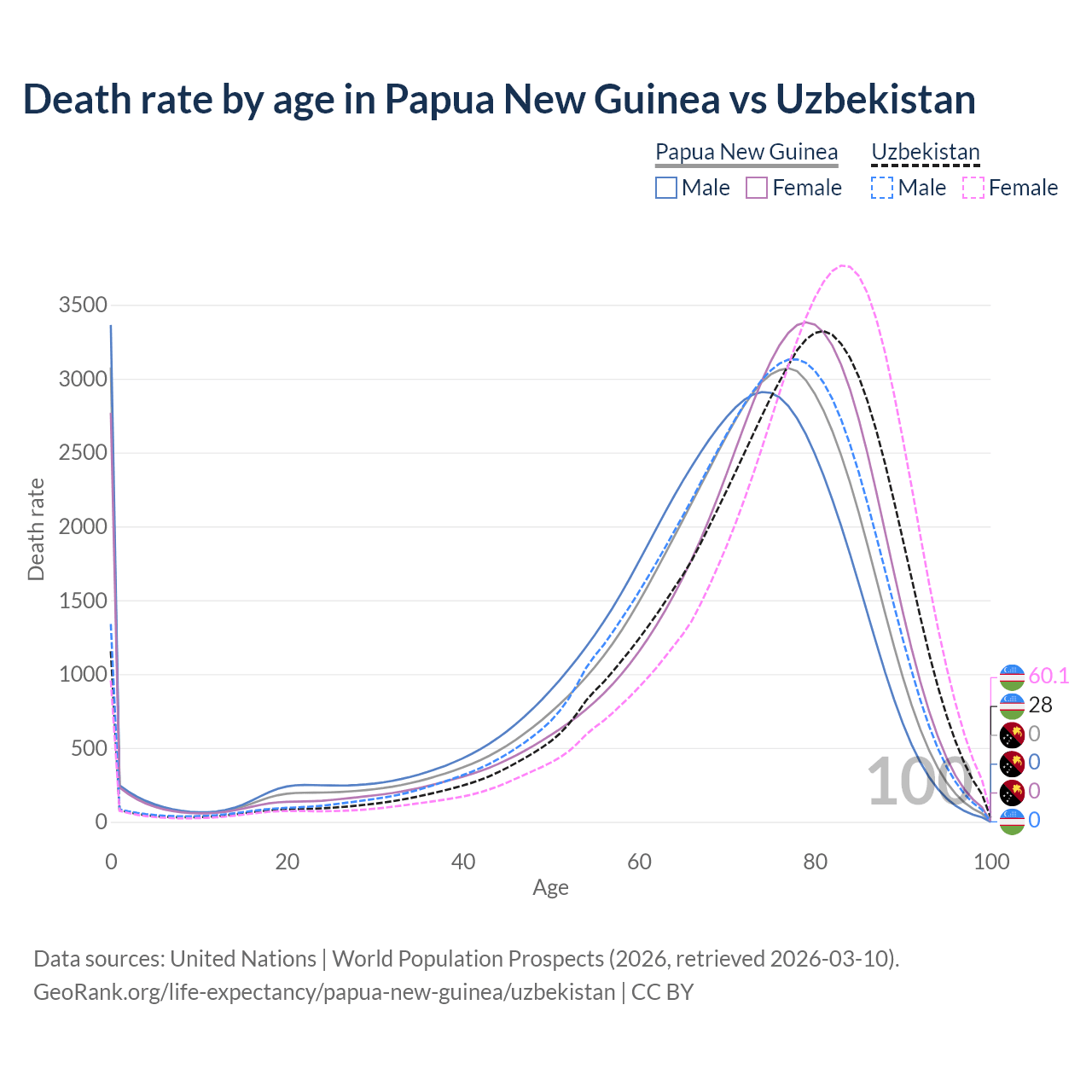 In Papua New Guinea, the most common age of death is 0, compared to 81 in Uzbekistan. The median age of death is 71.7 in Papua New Guinea and 76.4 in Uzbekistan, meaning only half of each cohort is expected to live past that age.