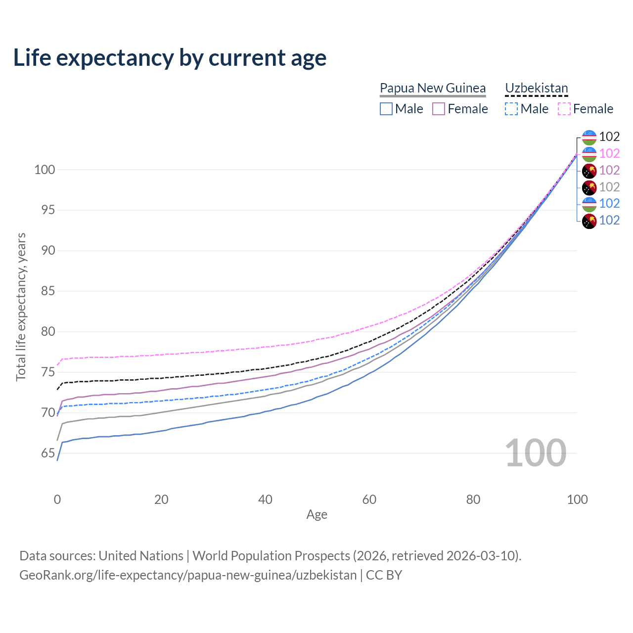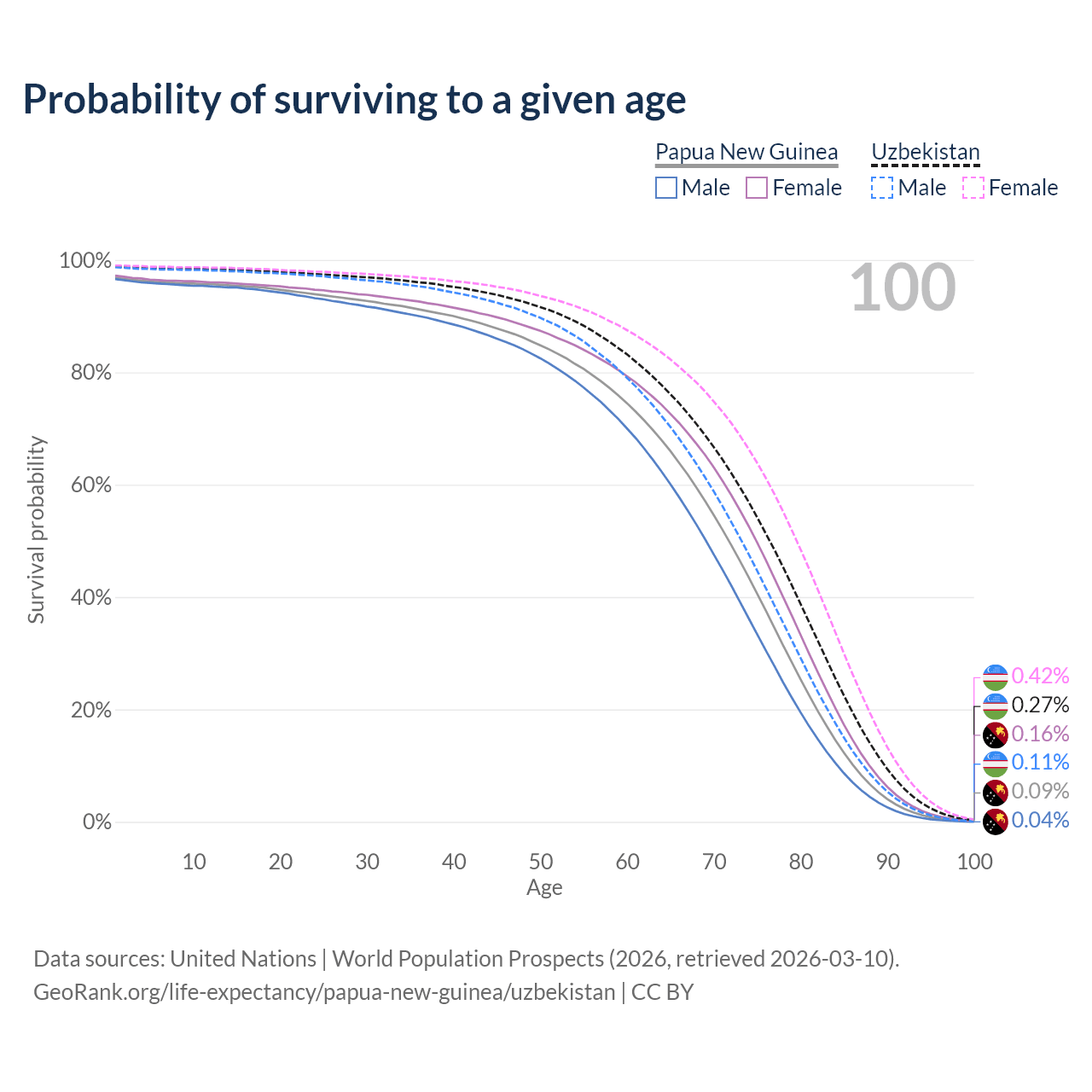This life expectancy calculator shows the odds of living to 100, 95, 90, and below based on current age for both males and females in Papua New Guinea and Uzbekistan, along with mean and median age of death. The calculations are based on the 2026 life tables (actuarial tables) from the UN World Population Prospects.