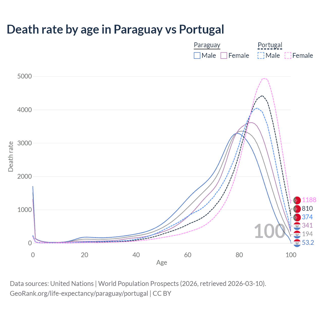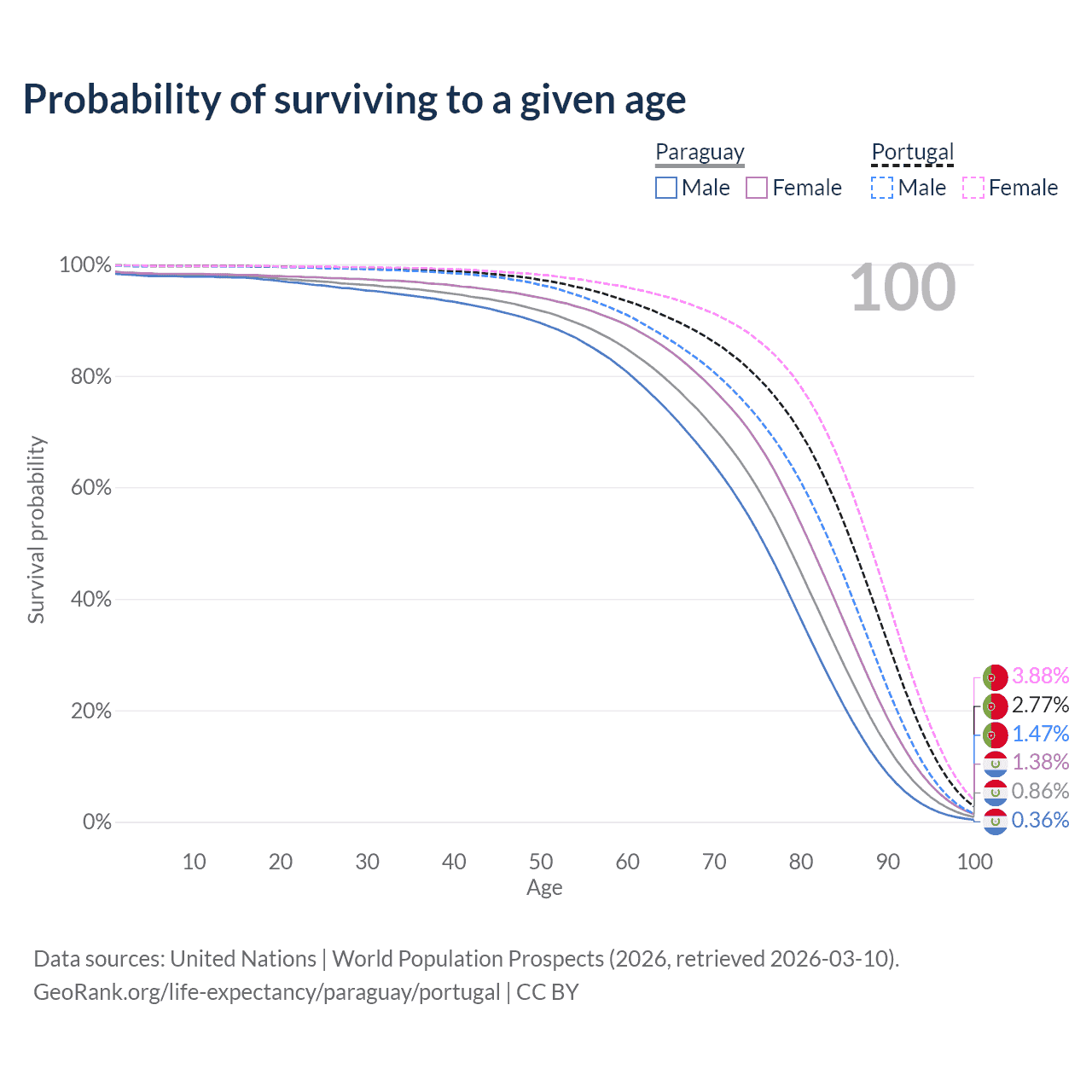 This life expectancy calculator shows the odds of living to 100, 95, 90, and below based on current age for both males and females in Paraguay and Portugal, along with mean and median age of death. The calculations are based on the 2026 life tables (actuarial tables) from the UN World Population Prospects.