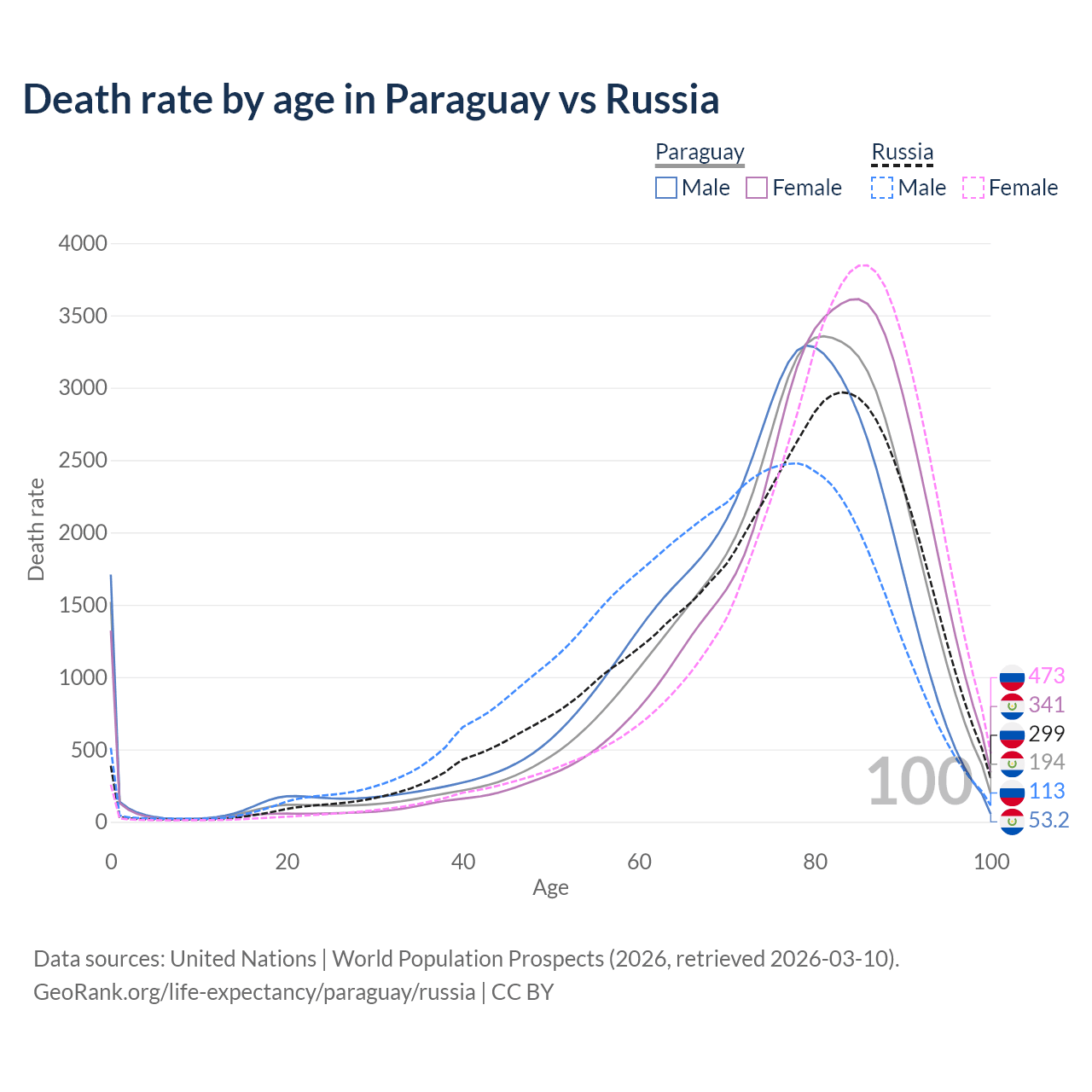 The average life expectancy at birth is 74.2 years in Paraguay vs 73.7 in Russia. Paraguay is ranked 100/197 by life expectancy, and Russia is 107/197. In Paraguay, the life expectancy is 71.3 years for males and 77.4 years for females. In Russia, it's 67.9 years for males and 79.5 years for females.