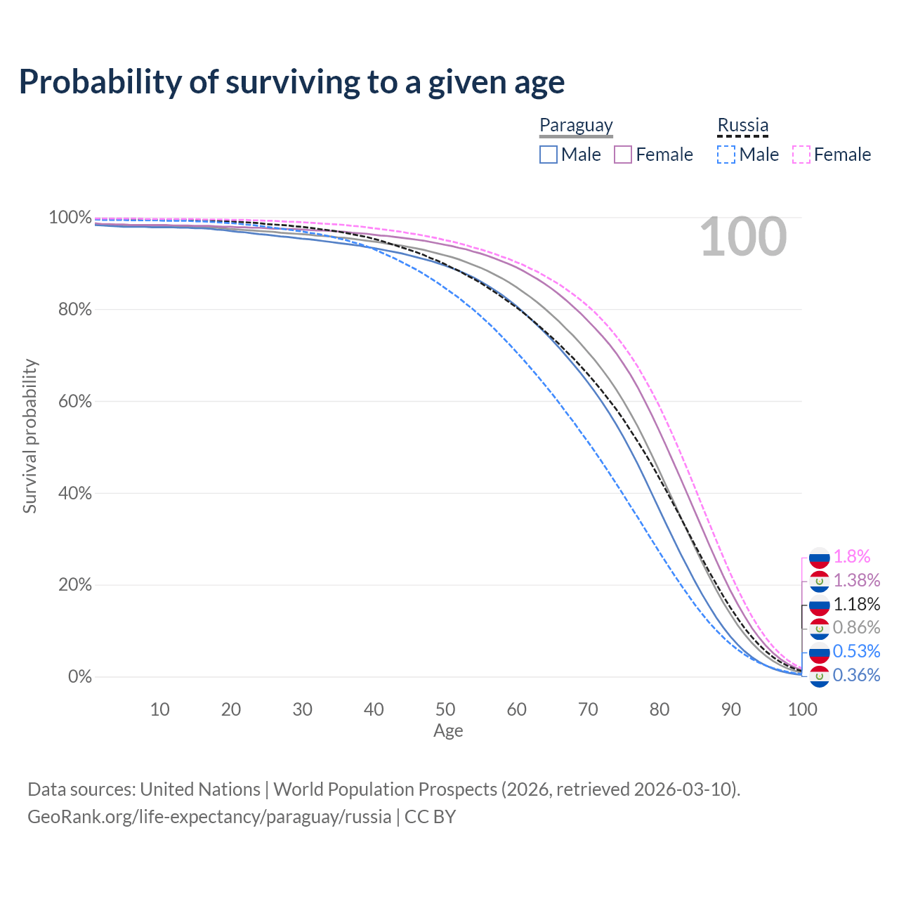 This life expectancy calculator shows the odds of living to 100, 95, 90, and below based on current age for both males and females in Paraguay and Russia, along with mean and median age of death. The calculations are based on the 2026 life tables (actuarial tables) from the UN World Population Prospects.