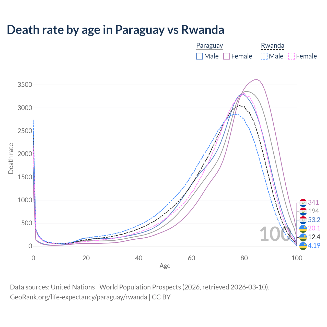 The average life expectancy at birth is 74.2 years in Paraguay vs 68.5 in Rwanda. Paraguay is ranked 100/197 by life expectancy, and Rwanda is 148/197. In Paraguay, the life expectancy is 71.3 years for males and 77.4 years for females. In Rwanda, it's 66.1 years for males and 70.6 years for females.